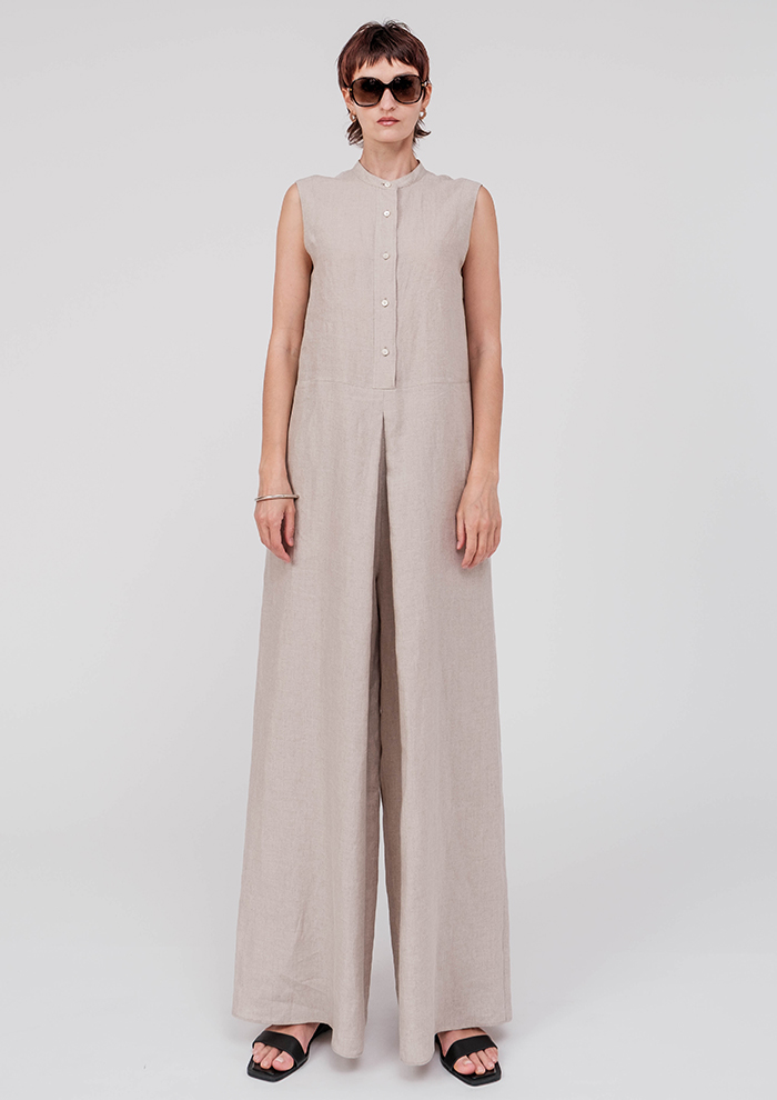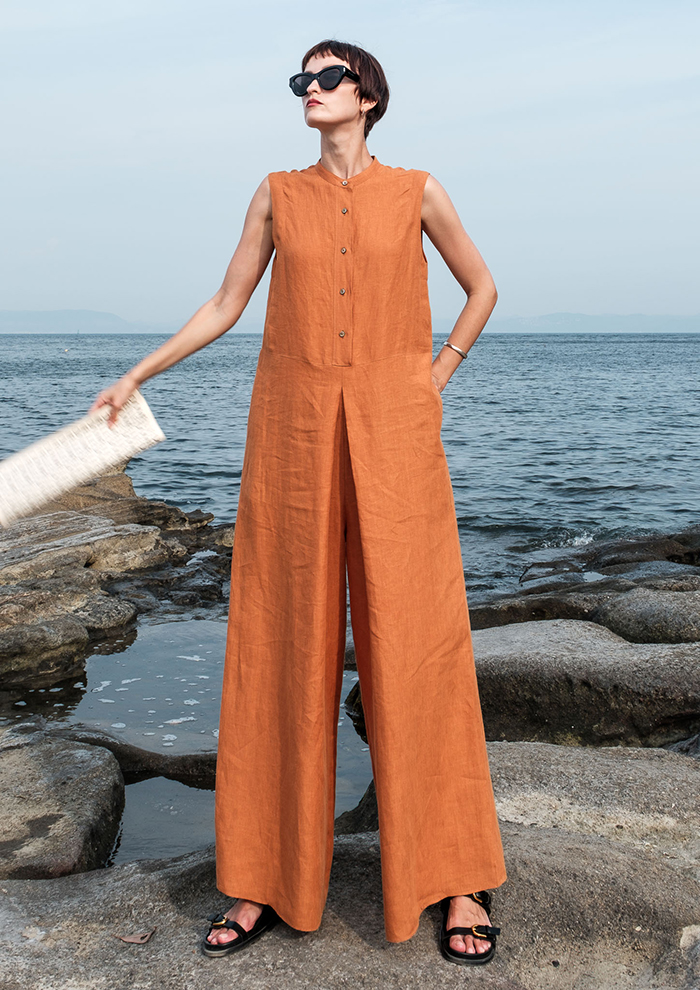 「こちらは、上質なベルギー産リネン100%で仕立てた、スリーブレスでモード感漂う大人のジャンプスーツ。シャツディテールの比翼仕立てバンドカラーと、タック入りワイドパンツを組み合わせたようなデザインが洗練された印象を与えます。同素材のシャツと合わせた、盛夏にも涼やかなセットアップスタイルもおすすめ」。
