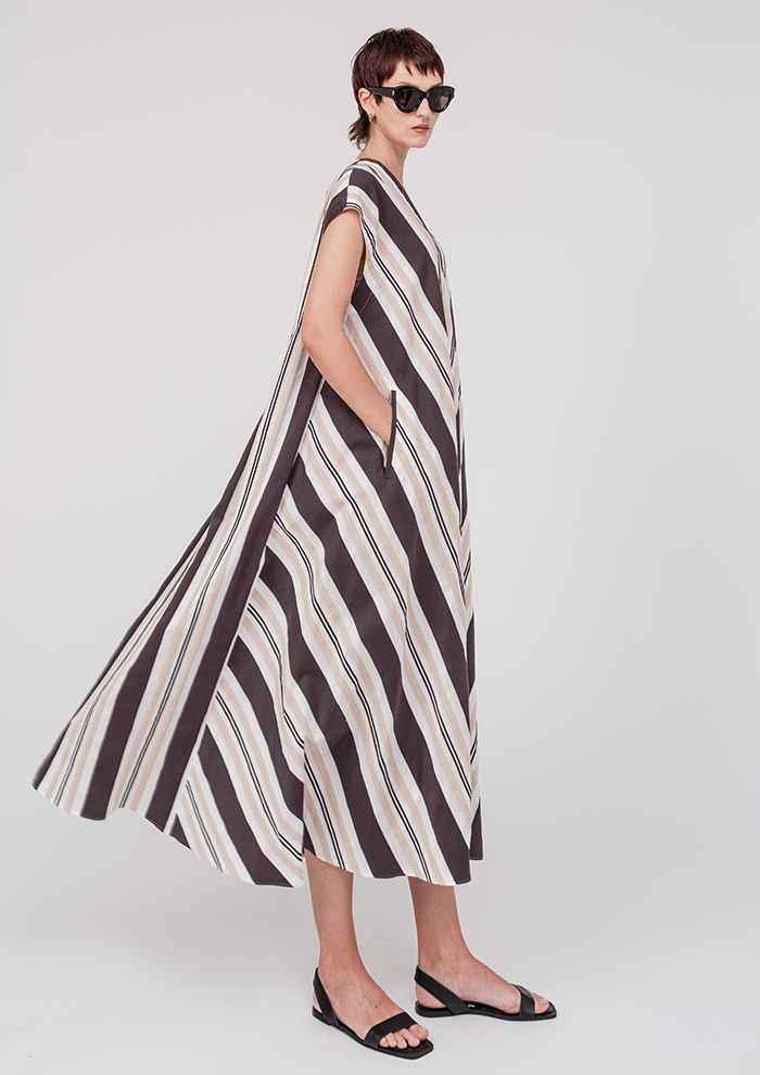 「ナイロンとコットンのオリジナル国産素材を使用した、アートピースのような存在感を放つビッグストライプドレス。凹凸のある表面感が特徴で、フロントのV字切り替えやバックスタイルのタックフレアが、動くたびに豊かな表情を引き出します。着るだけで気分が高揚する主役級の一着」。