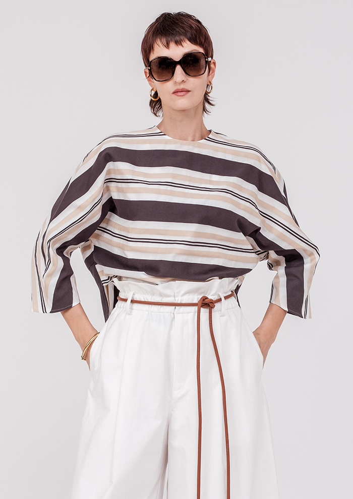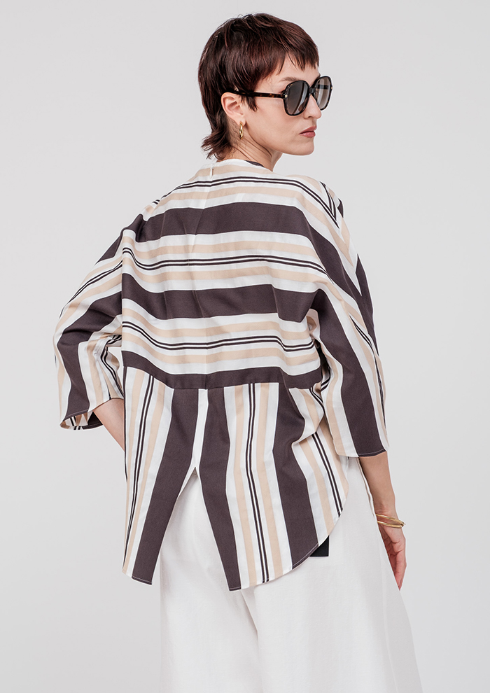「ドレスと同素材のブラウスは、立体的なフォルムとストライプ柄に視線が集中。前身頃はボーダー使いでシャープに見せつつ、後ろはストライプ柄に切り替えた、遊び心あふれるバックスタイルが魅力です」。