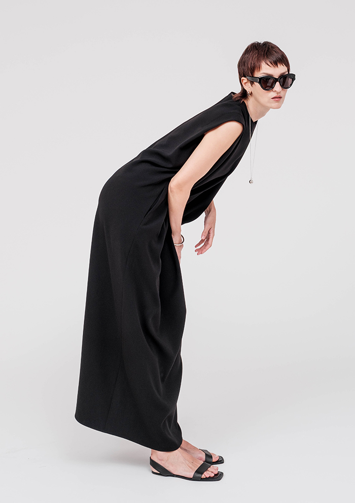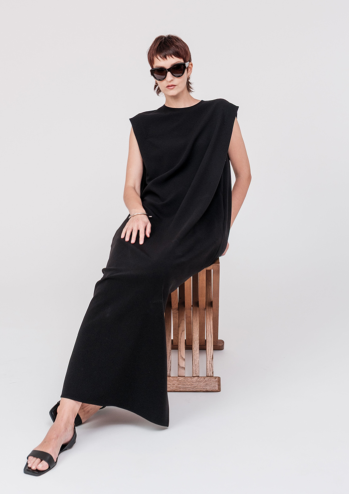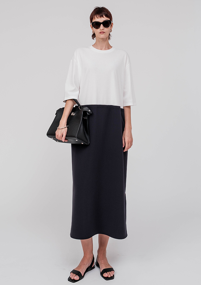 「デイリーからドレスアップまで活躍する万能サマードレスにもご注目を。ドライタッチで清涼感のある国産の高密度コットンフライスジャージと、しなやかなドレープ性を持つトリアセテート×ポリエステルを組み合わせたコンビワンピースです。すっきりとしたシンプルなスティックラインと異素材のコントラストによって、1枚でもさりげない洒落感を演出。締めつけのないウエストコンフォート仕様も、リラックスした着心地ときちんと感を両立します」。