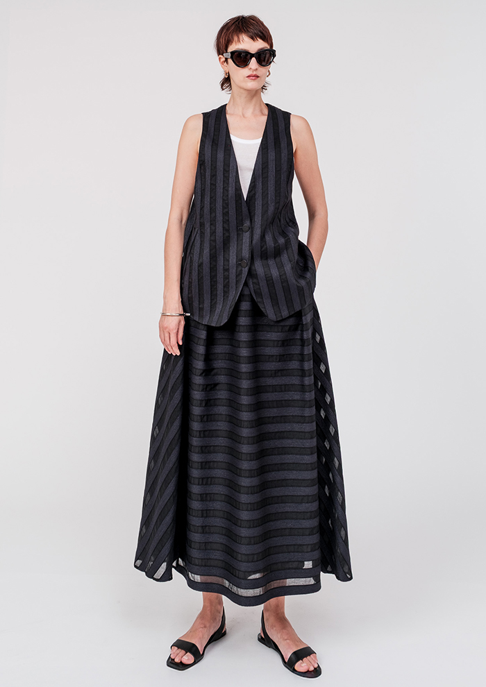 涼やかさとマニッシュさを両立する夏のセットアップ。シアサッカーのような軽やかさがある国内生産のオリジナル生地で仕立て、洗練された大人のスタイルに。メンズライクなショート丈ベストは、裏地に肌触りのよい天然素材を使用し盛夏でも快適です。同素材のスカートは、適度なハリ感を生かした美しいボリュームが魅力。巧みなカッティングによって柄が斜めに流れる、視覚的変化も楽しめます」。