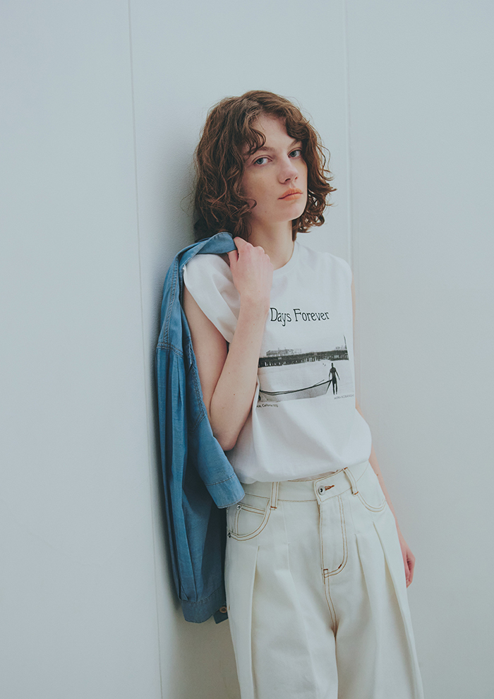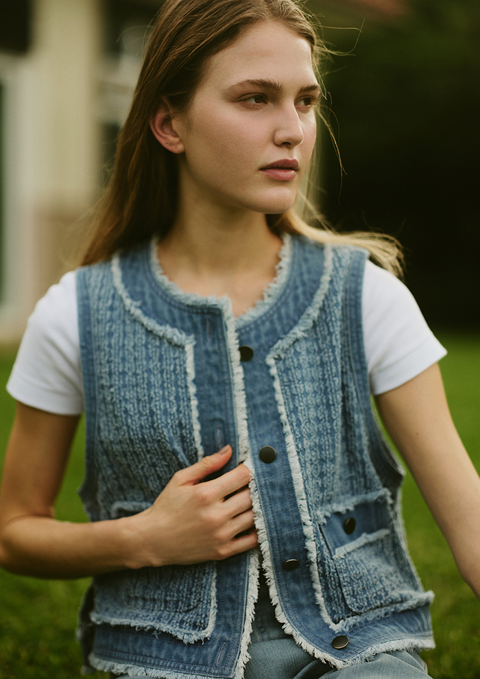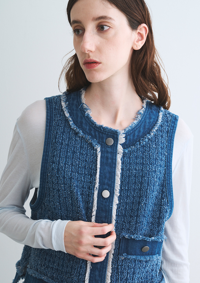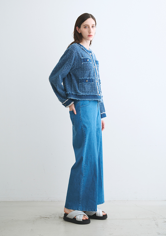 「スタイリングを爽やかにまとめるデニムアイテムでは、新作の“ニードルパンチ デニム”が人気。特殊な針で生地の繊維を掻き出したツイード調の表情が魅力です。切りっぱなしのフリンジディテールも甘くなりすぎないポイント。デニム合わせでセットアップ風に楽しむのも◎」。