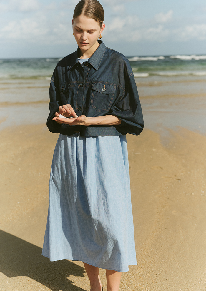 「ややツヤのあるシアーデニムは、旬のシアー素材の変化球アイテム。ジャケットはGジャンよりも気軽に、暑い時期でも羽織れます。それに同素材の裾フレアスカートを合わせて、カジュアルさをフェミニンに落とし込むのもおすすめ」。