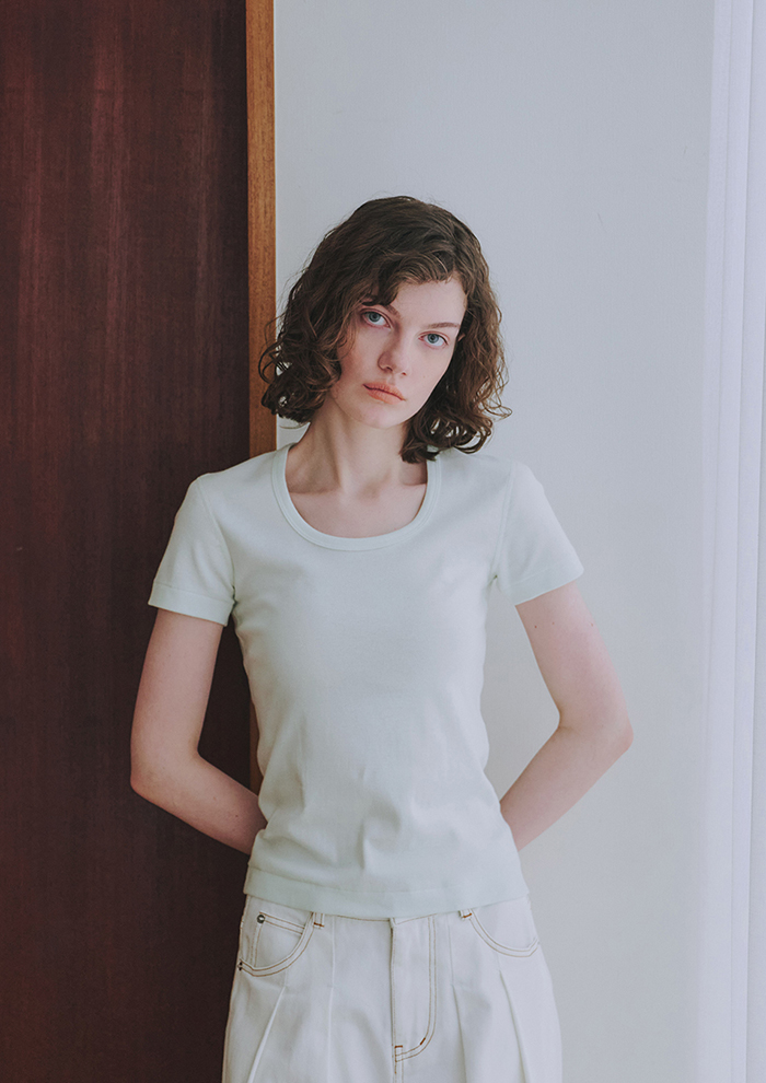 「「スリードッツ」のベストセラーにしてブランドアイコンのUネックTシャツ“ジェシカ”。ネック上部でややすぼまるスクープネックは、1枚でも存在感があり、ジャケットのインにするとほどよい抜け感が感じられます。ネックレスも映えるので、春夏のヘビロテアイテム確実。トレンド感のある淡いカラーの新色にもご注目ください」。