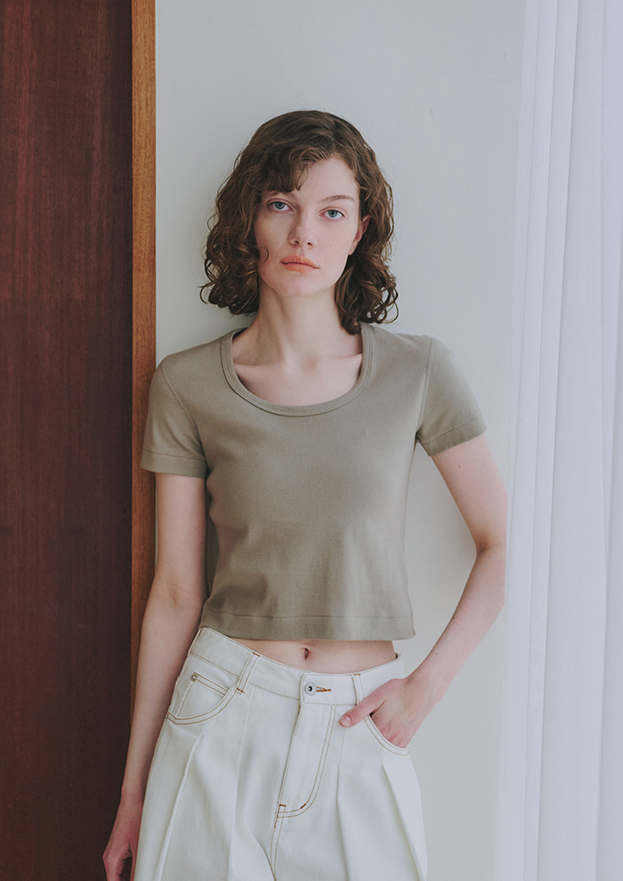 「昨年の発売後すぐに完売してしまったクロップド丈も、新色を追加して再入荷。ボリュームの出るボトムとも好バランスです。ハイウエストのボトムなら肌が隠れる絶妙なレングス。ネックや袖はベーシックタイプのフィットそのままに、ボディラインはコンシャスになりすぎないややボクシーなシルエットです」。