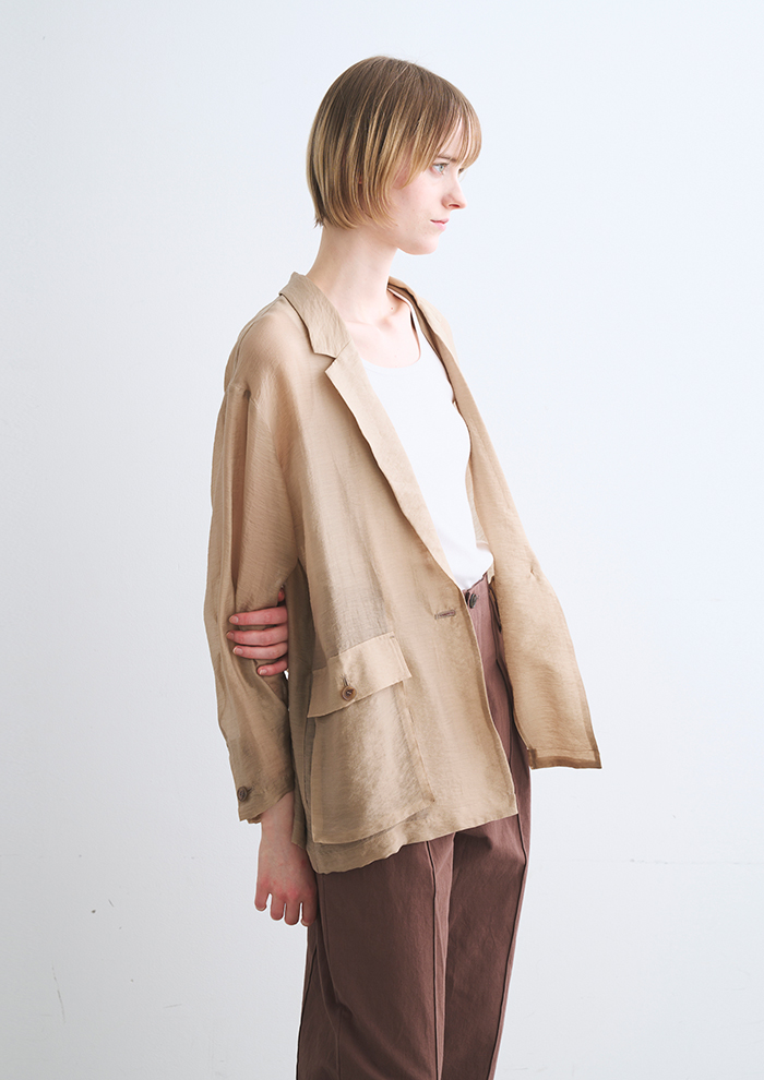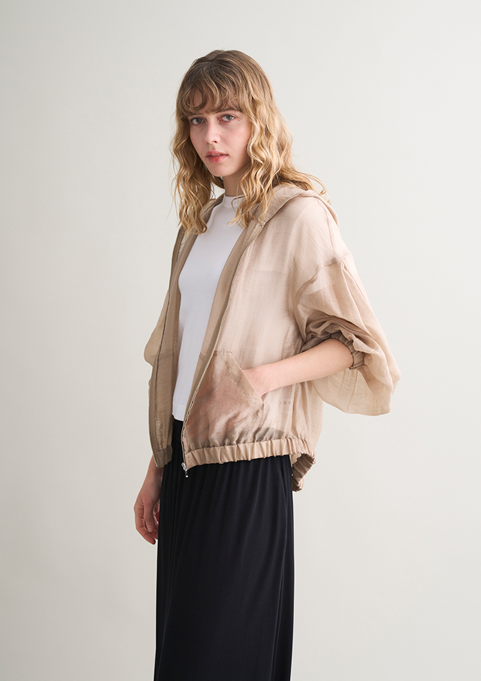 「人気のシアー&光沢素材“シャイニーシャツ”シリーズには、リクエストを多数いただいたジップフーディが再登場。そして、フラップ&マチ付きの立体ポケットがサファリライクなジャケットも仲間入りです。フェミニンな素材だからこそ辛口要素で引き締めて」。
