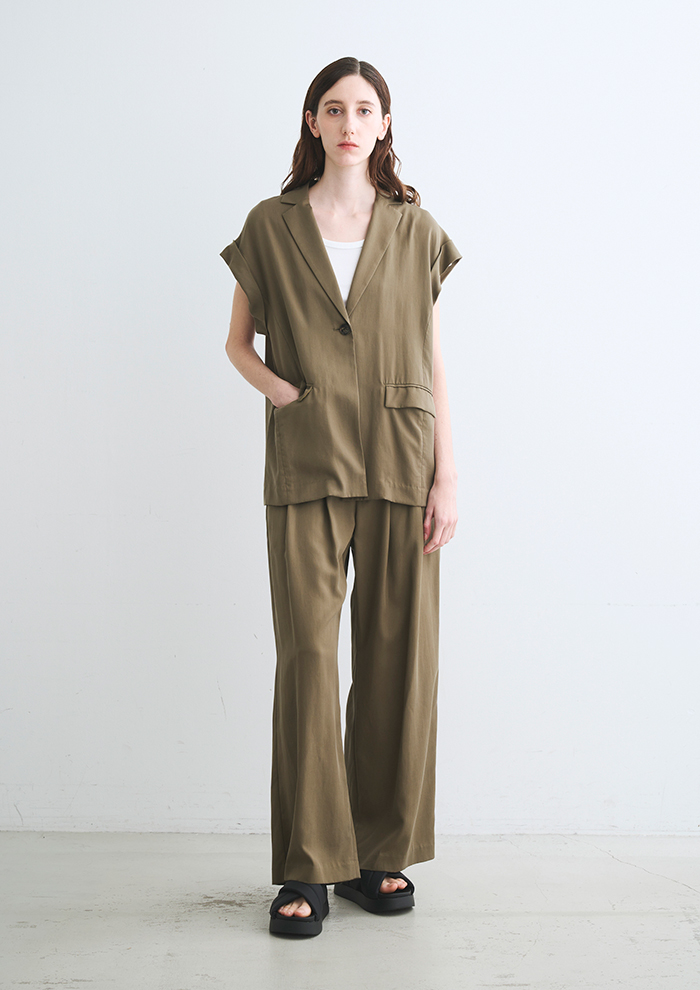 「こちらもナチュラルなツヤがエレガントな新素材“フィブリオ”シリーズ。表面を微起毛させた、とろんとしたツヤのある素材が着心地抜群です。ジャケット&半袖ジレに同素材のパンツも展開。肩に引っ掛けて着流せば、こなれた着こなしに。インにグラフィックTを入れると、ぐっとカジュアル感が出ます」。