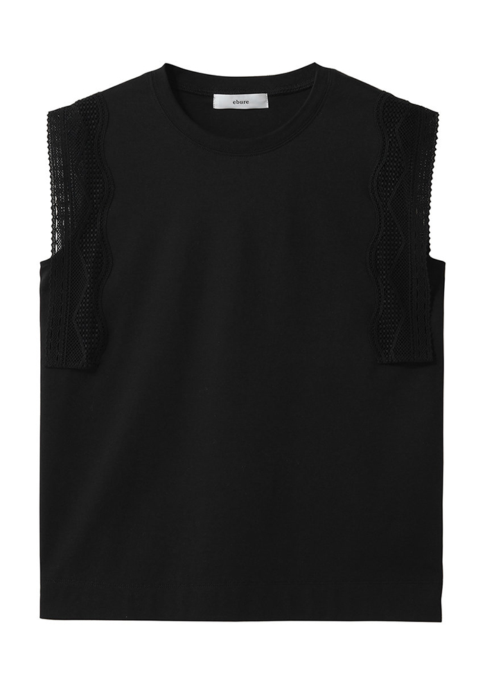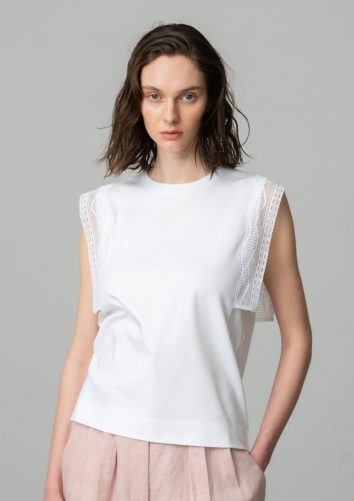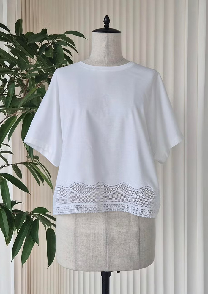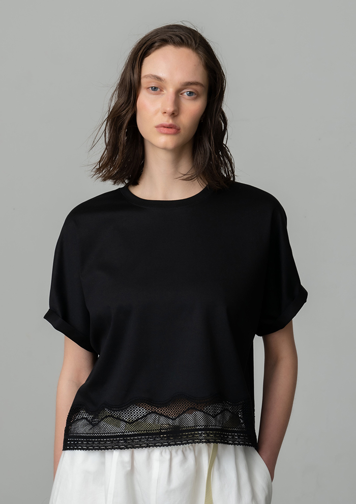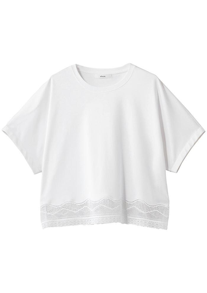 繊細なレースをあしらった、ハイゲージのスムース素材。Tシャツの域を超えた、エレガントな気品を纏って。