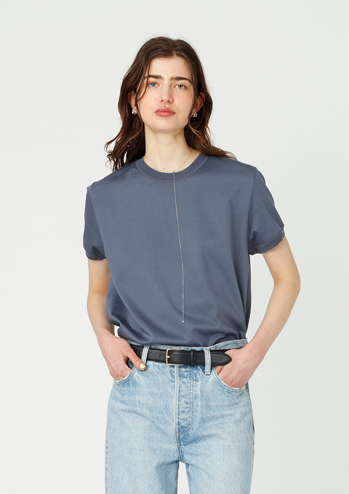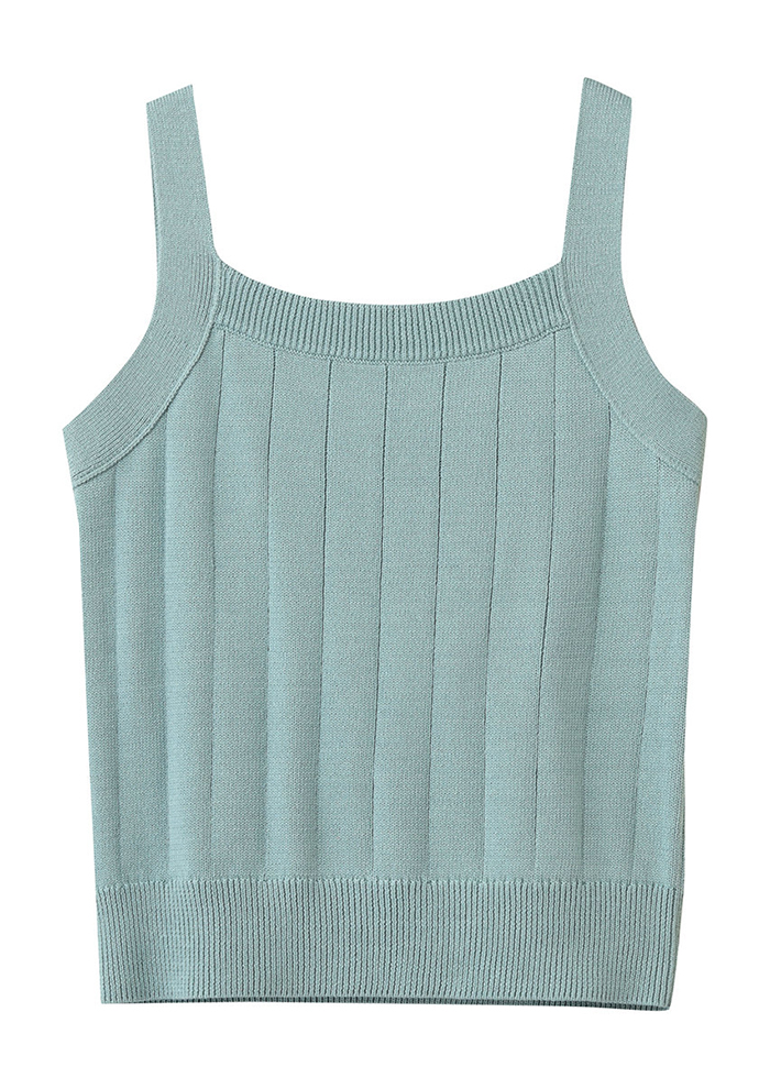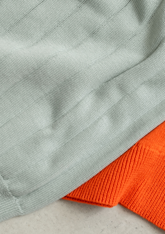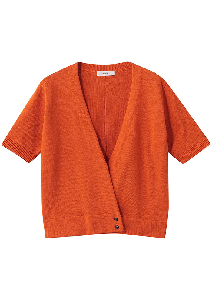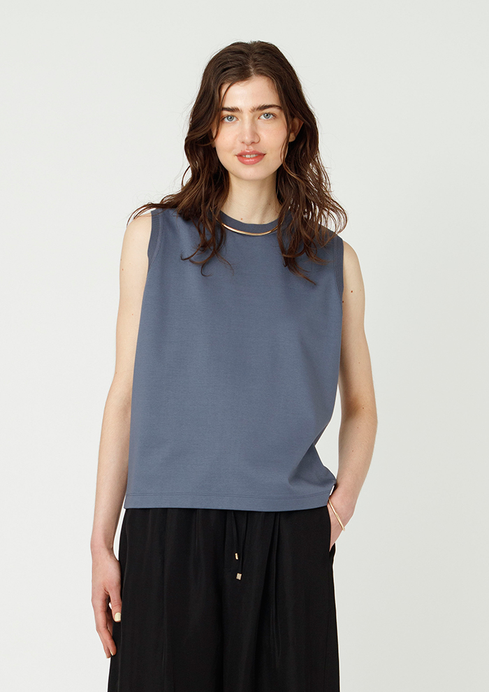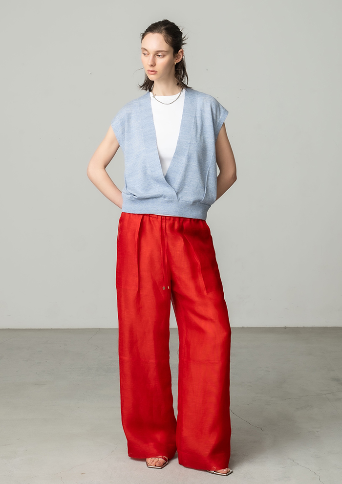 「細番手コットンをリリヤーン加工した糸にボタニカル染を施し、自然なツヤと清涼感のある肌触りに仕上げたサマーニットのシリーズも要チェック。ワイドリブ組織のコンパクトなキャミソールは、首まわりが詰まったタンクトップなどに重ねてベスト感覚で着たり、同素材のスカートとラフに合わせてシャツを羽織ったりと、スタイリング自在です。羽織としても着まわせるカシュクール型トップスもラインナップ」。