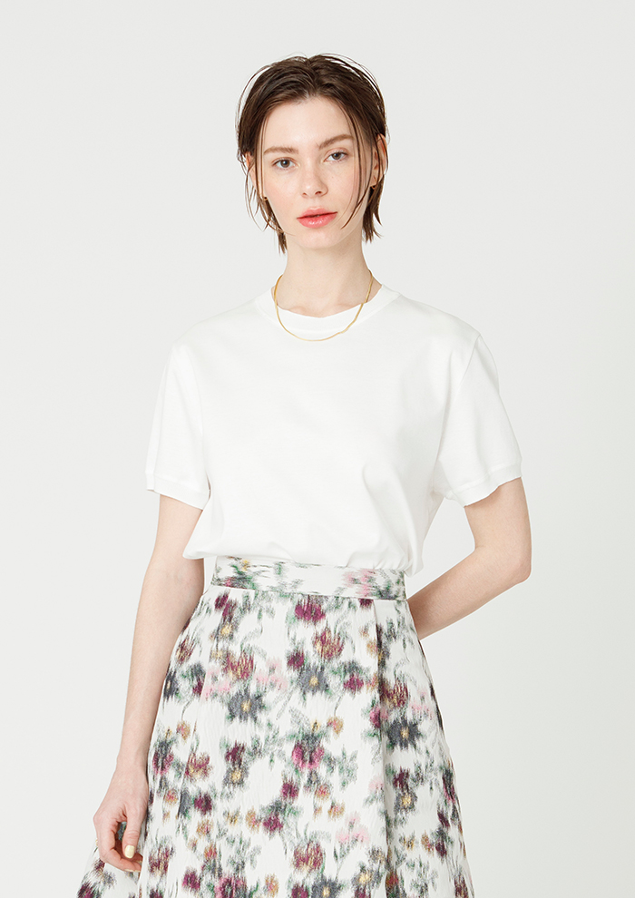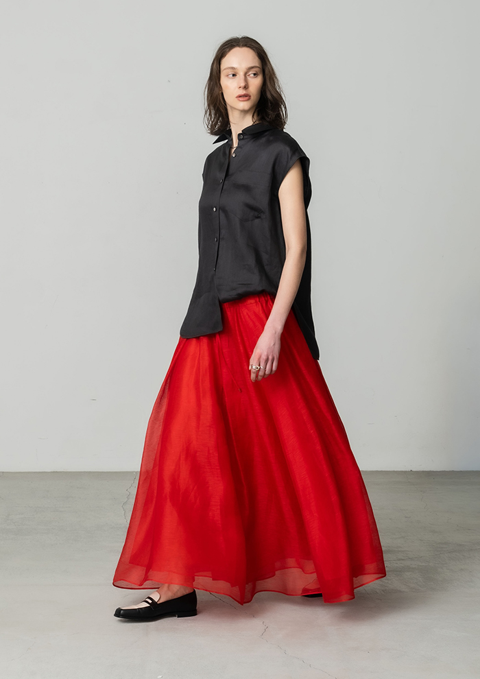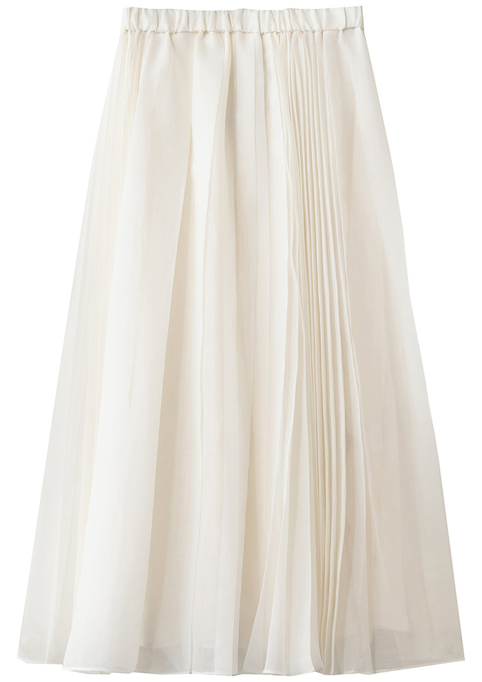 「ランダムな車ひだのプリーツとアコーディオンプリーツをミックスさせたぜいたくなプリーツスカート。柔らかさと華やかさを醸しながら、涼しく軽やかな着心地を叶えています」。