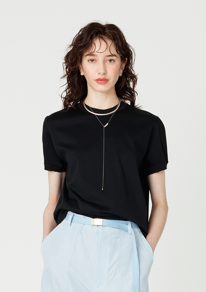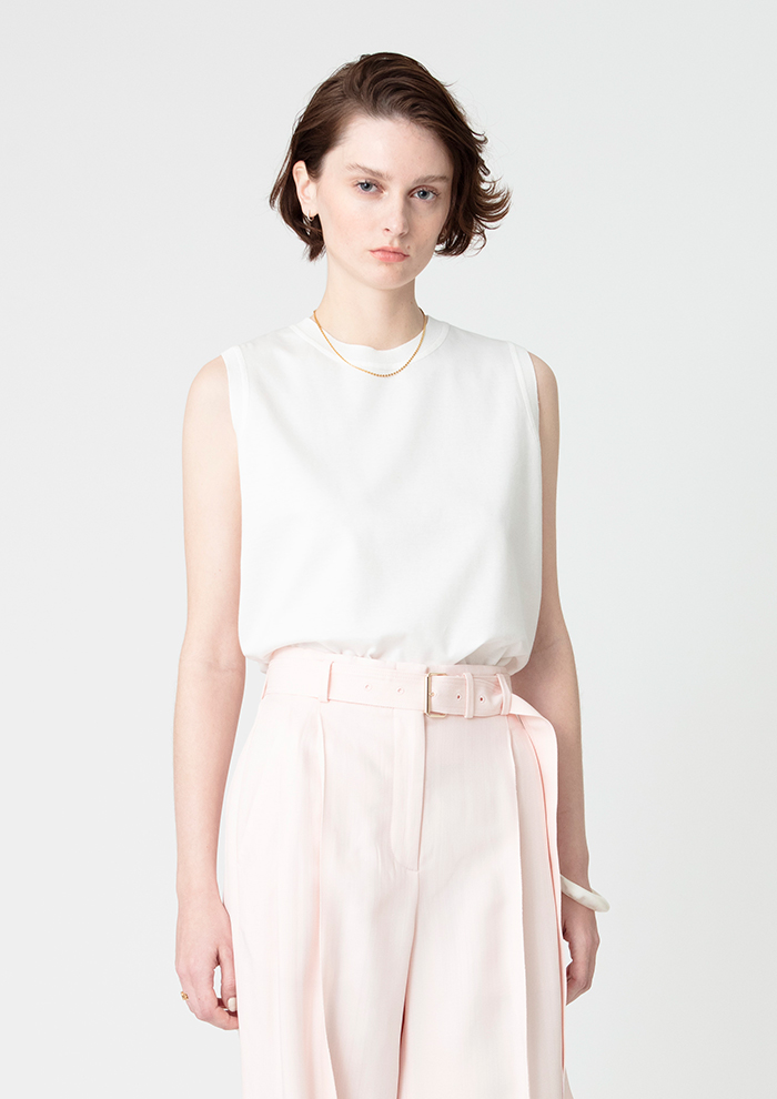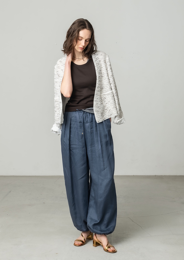 「まずご紹介するのは、適度な膨らみ感と光沢感が大人の装いにフィットする“ラミーサテン”シリーズ。シンプルなノースリーブのシャツは、少し肩にかかる袖丈が気になる二の腕をカバー。裾にボリュームを持たせたバルーンパンツでセットアップとして着こなすのもすてき」。