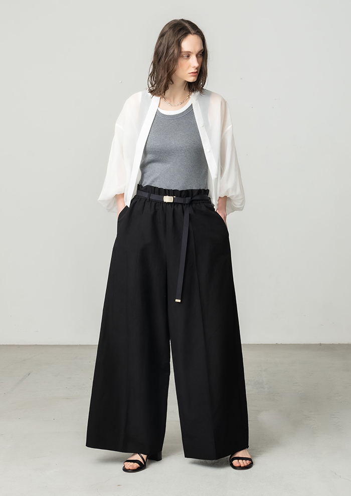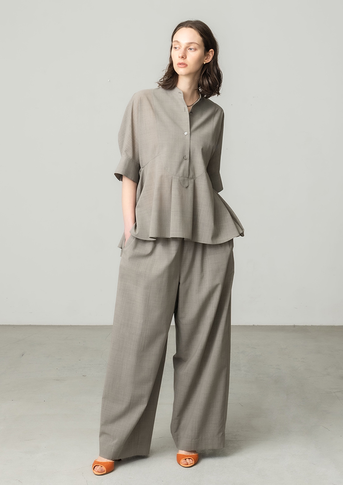 「深みのあるトップ調の色合いが上品な“ドライシアーウール”シリーズ。薄手ながら肌離れが良く、適度なハリ感がこれからのシーズンにぴったりです。クリーンなボザムデザインで甘さを抑えたフレアブラウスは、高めのウエスト切り替えによってスタイルアップ効果も抜群。セットアップで合わせられるゴムシャーリング仕様のワイドパンツは、センタープレスのように見える折伏せ縫いを施し、日常からオフィスまで幅広く対応」。