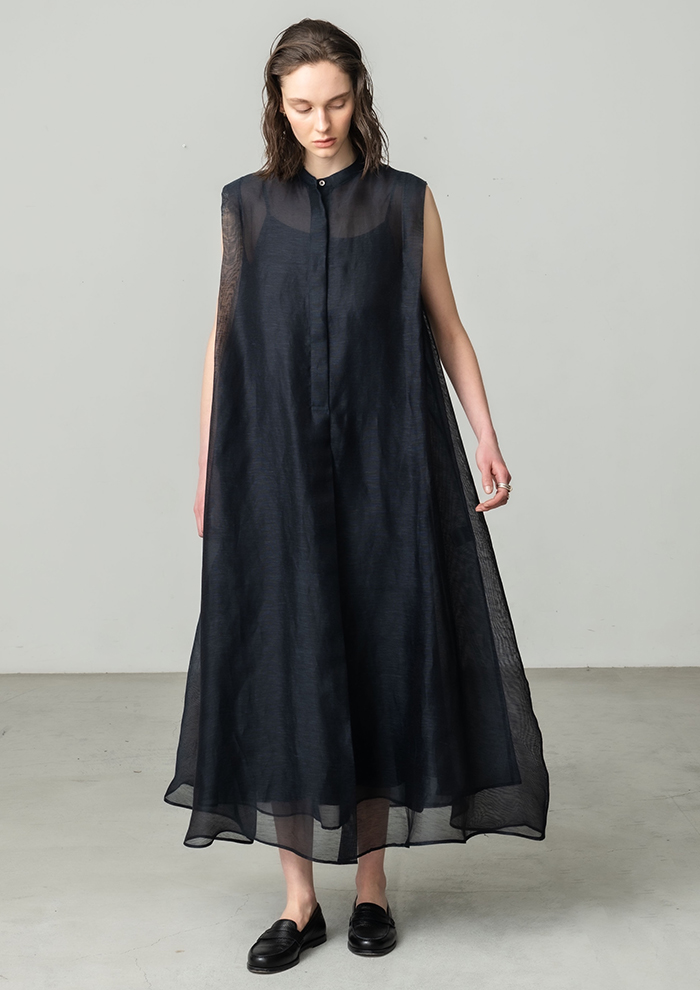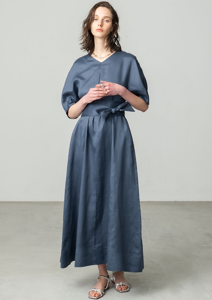 「大注目の”リネンシルクシアー”は、シルク混の高級感に加えて、リネン糸のフシのある表面感が日常使いにもグッド。華やかなテントシルエットのワンピースは、フロントのスキッパー開きと広がりすぎないシルエットがほどよい抜け感を添えます」。