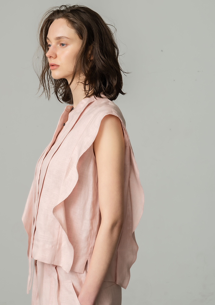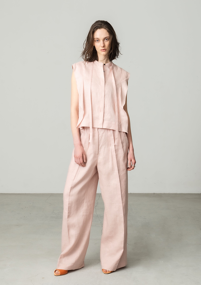 「桜やアジサイから生まれた柔らかな色合いが、装いに品のある華やぎをプラス。“ボタニカルリネン”シリーズ。ボウタイ付きのショート丈ブラウスは、さり気なくフレアな袖パーツが端正ななかに柔らかさをプラスします。同素材のワイドパンツとのセットアップはもちろん、どんなボトムとも好相性」。