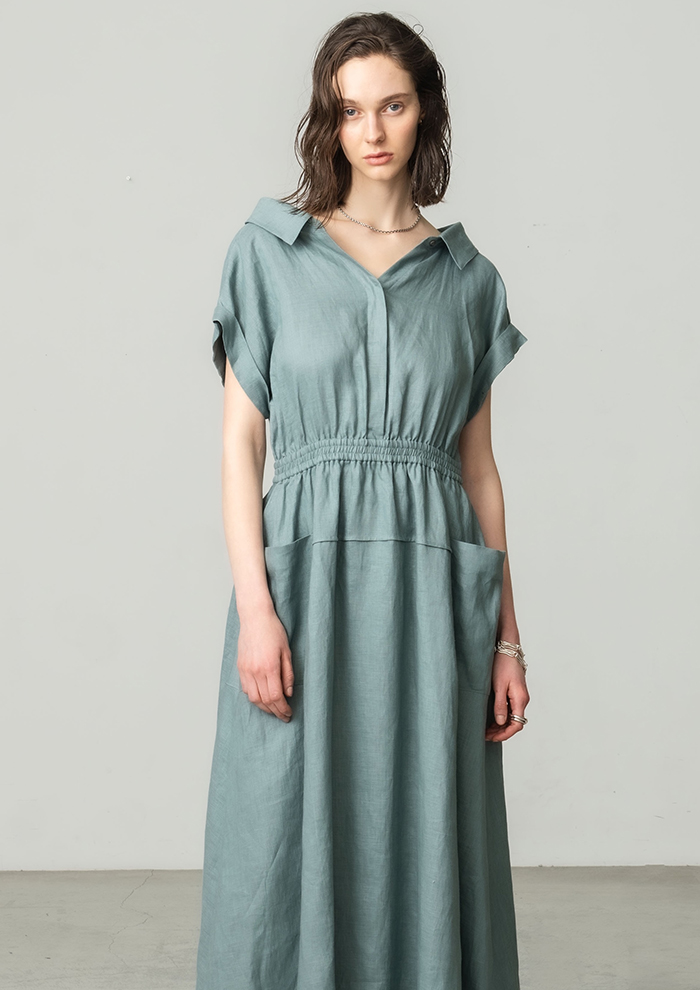 「オフショルダーのリネンワンピースは、ウエストゴム&パッチポケットのデザインが、汗ばむ季節にも涼しく抜け感のあるスタイルを実現。ウエストの切替えによって、さり気なく腰位置を高く見せてくれます」。