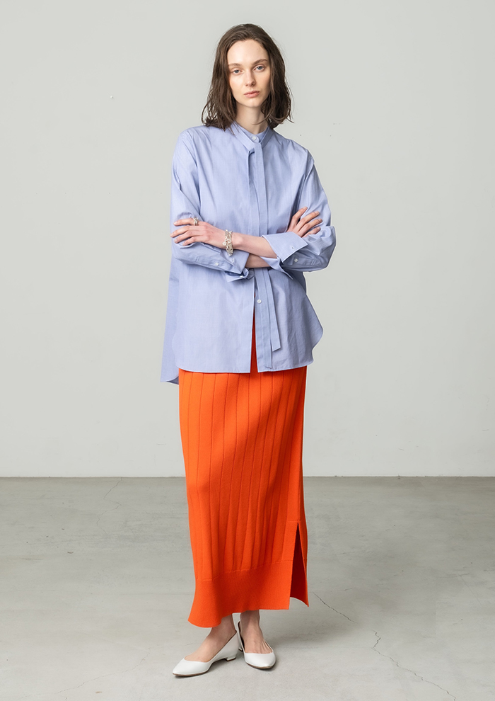 「Iラインシルエットのニットスカートは、すっきりと見せながらボディラインを拾いすぎず、左右のスリットによって足さばきも快適。ニットトップスとセットアップで着こなすのもおすすめ」。