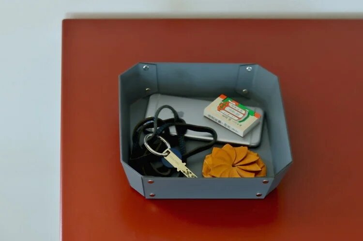 「パスコ」という、ヨーロッパで開発されたリサイクル可能な紙製繊維ボードを使った「craft_one/クラフトワン」のトレー。職人の手作業でひとつひとつ丁寧に打ち込まれたシルバー色のリベットがアクセント。玄関やリビング、デスク回りなどのカギや文房具といった小物を入れるのに丁度良いサイズです。