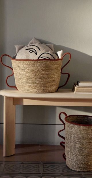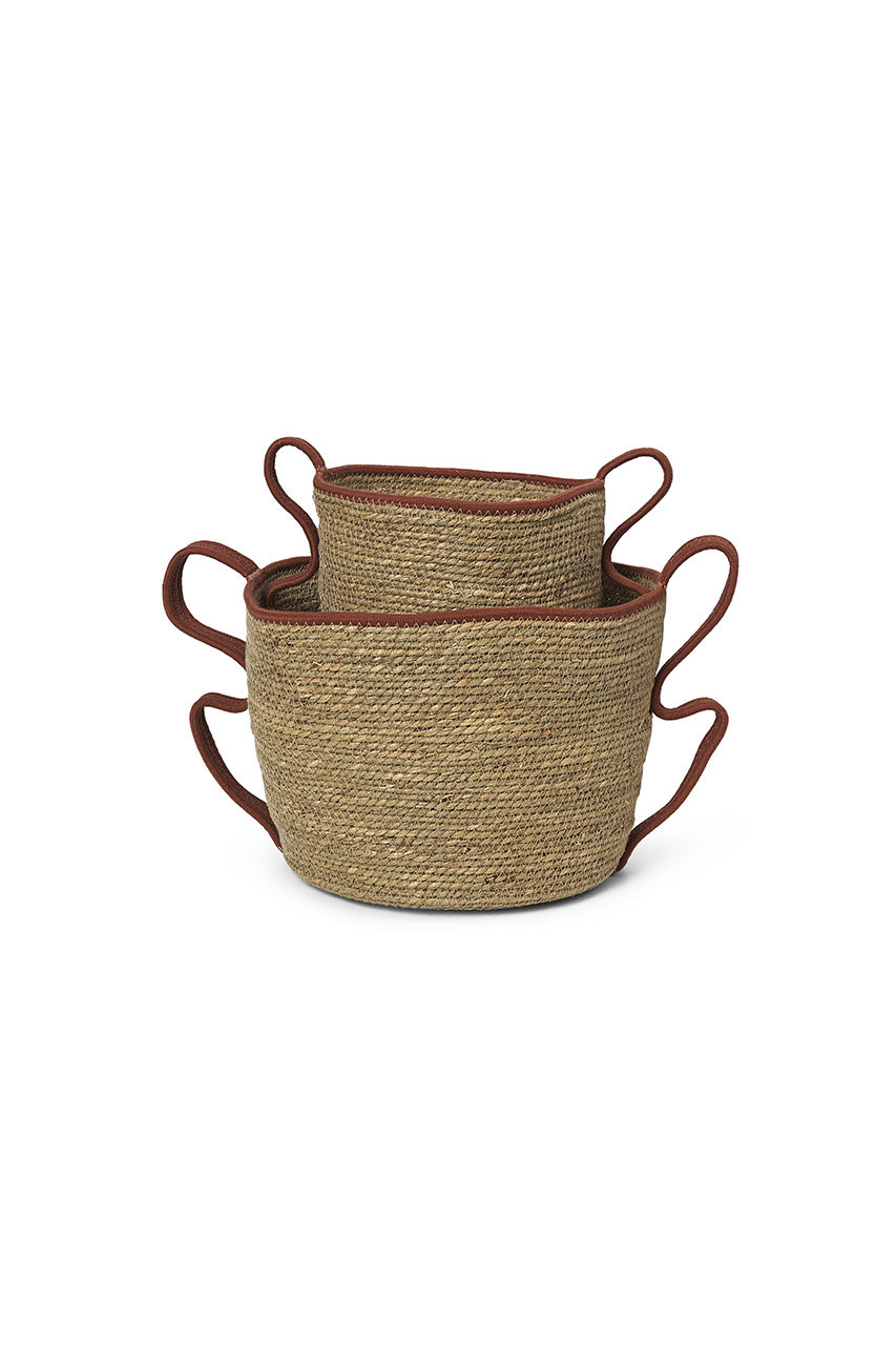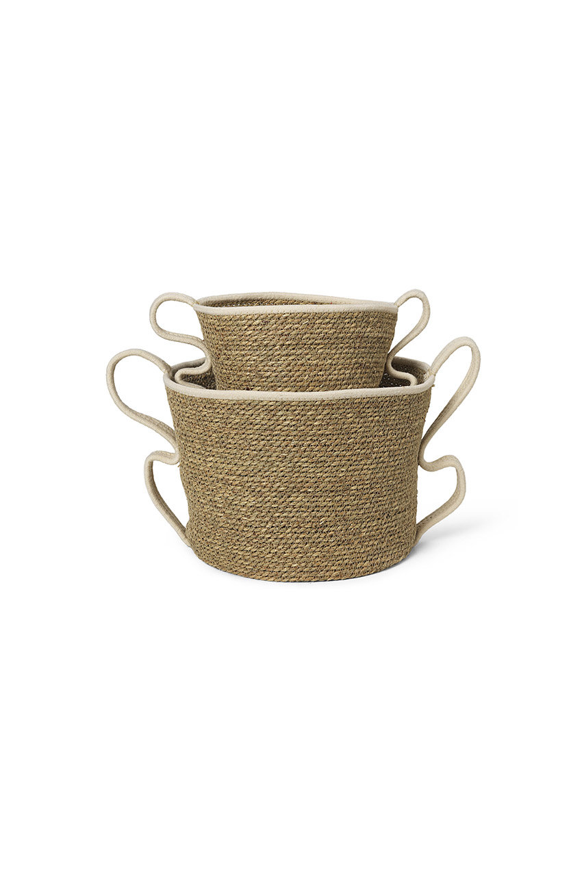 SサイズとLサイズの2つのカゴがセットになった「ferm LIVING/ファームリビング」の使い勝手の良い収納アイテム。縦長のSサイズは細々したものを、幅広のLサイズは雑誌やブランケットなど、用途に合わせて使い分けられます。一点一点手作りのため、温かみのある表情が魅力!