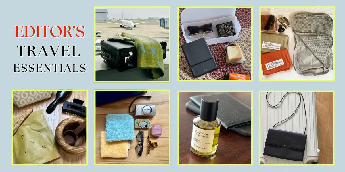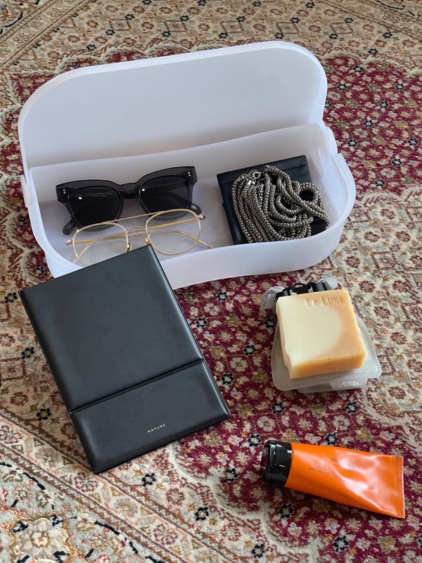 「夏旅に向け、旅の持ち物をアップデート! サングラスやアクセサリーのケースとして一癖あるデザインが旅の高揚感を盛り上る「ダネーゼ」のストレージケース。ヘアメイクの友人に教えてもらった“ナピュアミラー”はコンパクトかつ角度が自由に調整できる機能性も備えた優れもの。夏らしい「サヴォヌリー・ドゥ・ラ・リュヌ」の全身ソープは、イランイランとベルガモットのフレッシュな香りです。ハンドクリームは旅先でほのかに香らせる香水の代わりとしても重宝する「フラマ」の“Herbarium”を。」(エディター RYOKO)