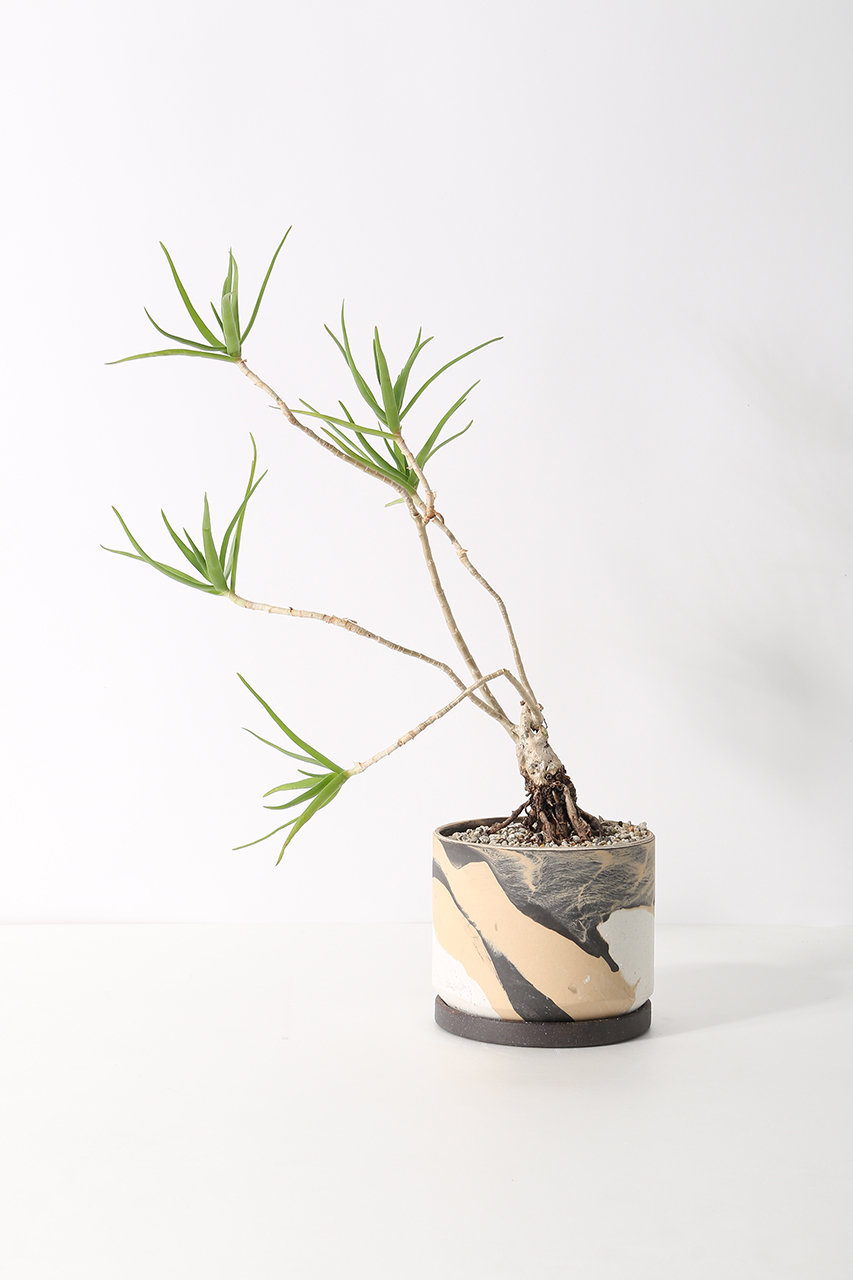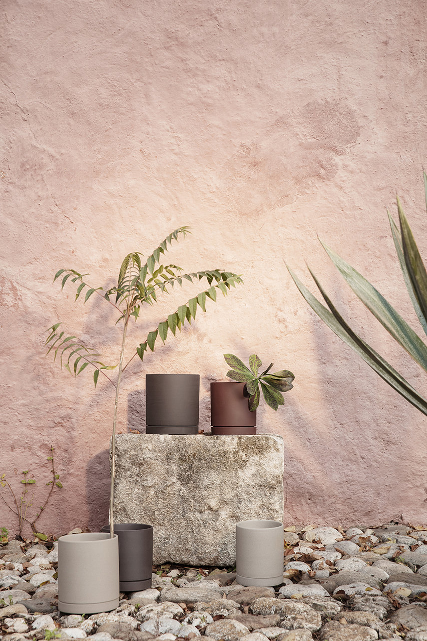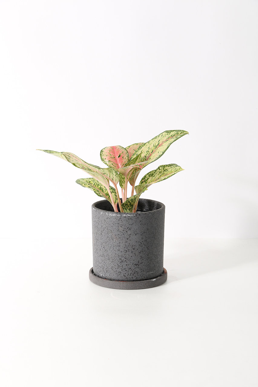 インテリアになじむシンプルなデザインとカラーのストーンウェア製のフラワーポット。室内でも使いやすいポットソーサー付きです。