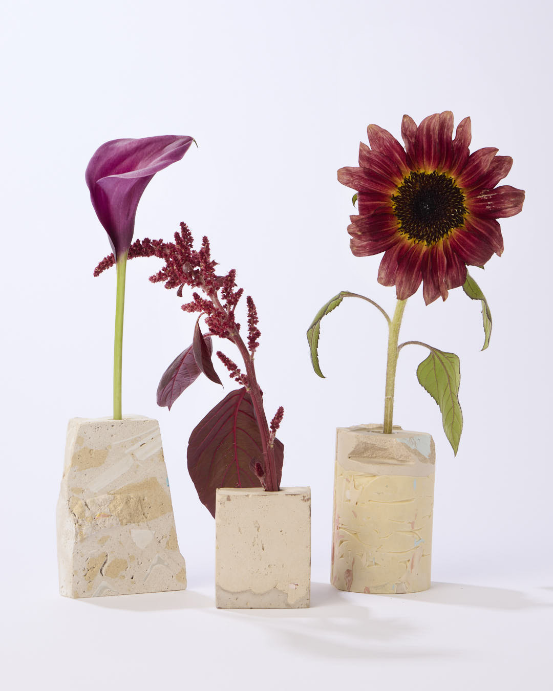深みのある花の色も、優しい素材感が引き立てます。縦長のフォルムにあわせて高さのバランスを楽しんで。