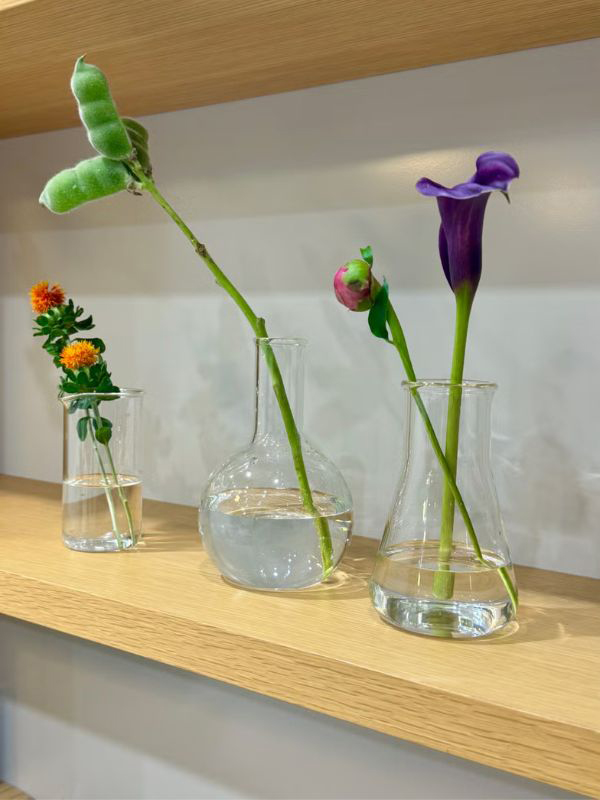 「シンプルでクリアな花瓶を探していたところ、これは!と思ったのが「ボロシル ラボ グラス」の花瓶。サイズや形もいろいろありますが、今回はフラスコ型をメインに3個並べて少しずつ生けてみました。真ん中のおまめのような個性的なフォルムのお花に惹かれやすいのですが、トリッキーなお花も難なく受け止めてくれるミニマルさが頼りになります。花束と一緒にプレゼントするのもよさそう!」(エディター KAORI)