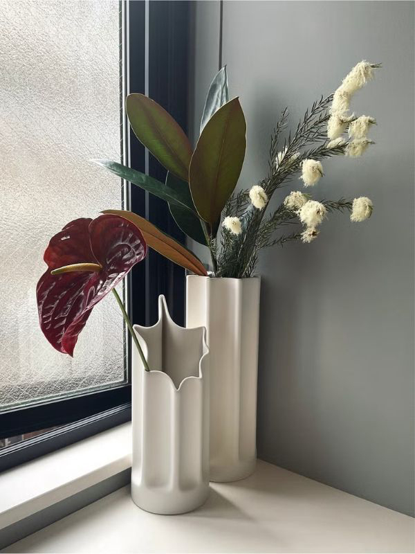 「エキゾチックでディープな色味の花に、繊細な植物を合わせるコーディネートが映える「DANESE/ダネーゼ」の“BAMBU”。一見アイコニックなデザインだけど、色味は落ち着いたヌーディートーンだから、花の個性もしっかり際立たせてくれます。ちょっと冒険した花合わせも、シンプルな一輪挿しも、全部すっと受け止めてくれるような懐の深さがあって。花もベースも、どちらも主役になれるところがお気に入り。」(アシスタントエディター TOMOYO)