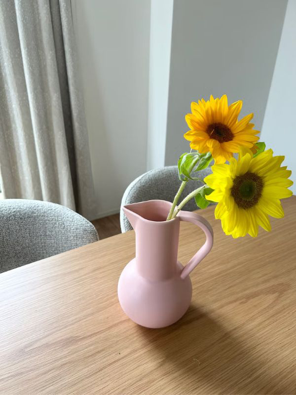 「お花を飾らなくてもオブジェのように置いて楽しめる「raawii/ラーウィー」の“Strom ミディアム ジャグ”。私は “Coral Blush”という色が特にお気に入りで、ビタミンカラーの向日葵と合わせて少しポップに飾ってみました。一輪、二輪飾るだけでも存在感がでる、洗練されたデンマークデザインはやはりすごいなと感じます。」(アシスタントエディター RINA)