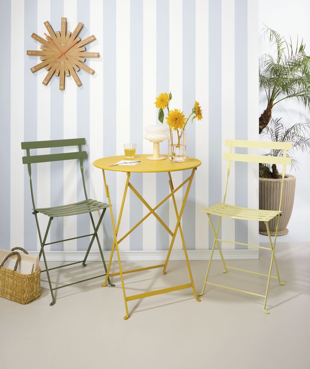 室内でもテラスでも楽しめるフレンチカジュアルな「フェルモブ」のテーブル&チェアに、韓国発「アイエルケーダブリュー」のポップな照明や「イッタラ」うっすらと色を感じられるフラワーベース、鳥の形の「アレッシ」のペーパーナイフでにぎやかに。同じく「アレッシ」の竹の壁掛け時計は、輝く太陽みたいに元気をくれます。
