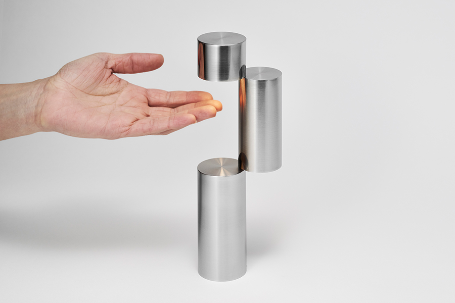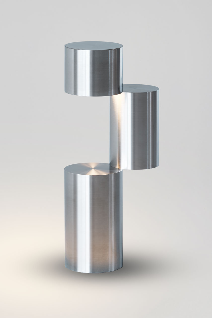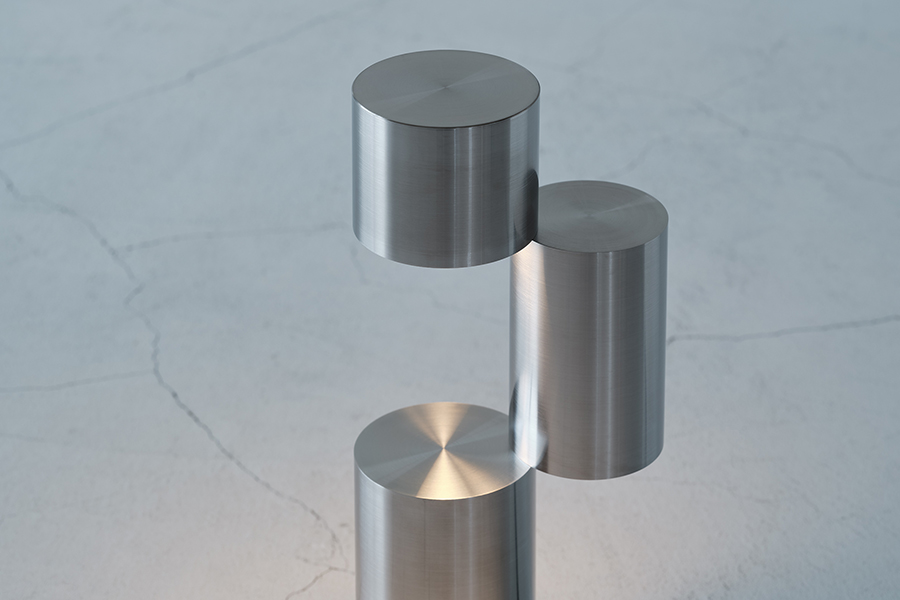スイッチやケーブルの露出が一切ない、磨き上げられたステンレス製のシリンダーが重なる洗練されたデザインと、滝のように光が落ちる光源が特徴的。手をかざすだけで、ON/OFFや調光が可能なタッチレスセンサーを搭載し、持ち運び可能なポータブルランプ。やわらかに灯る光が、静かな時間を演出します。
