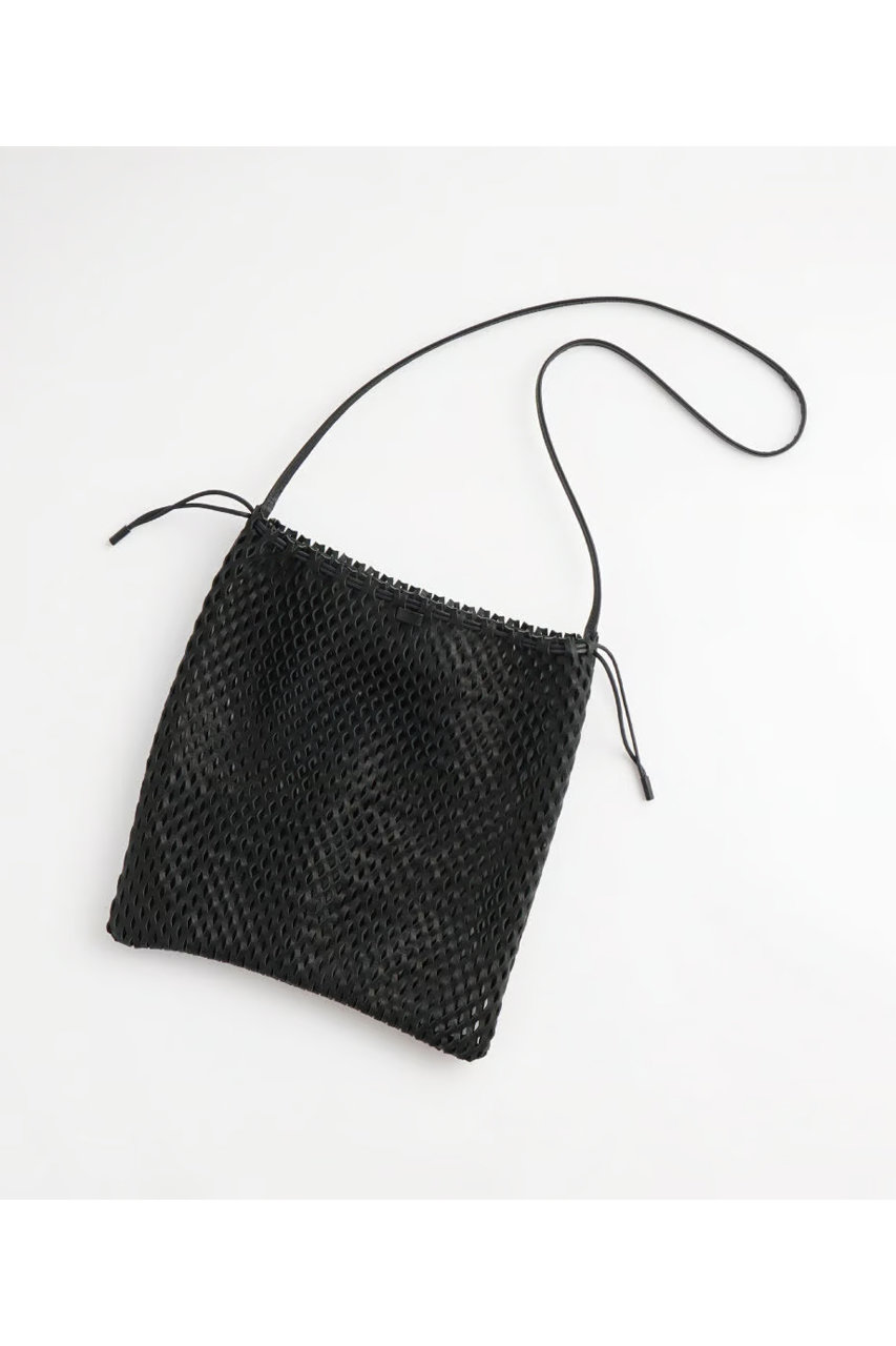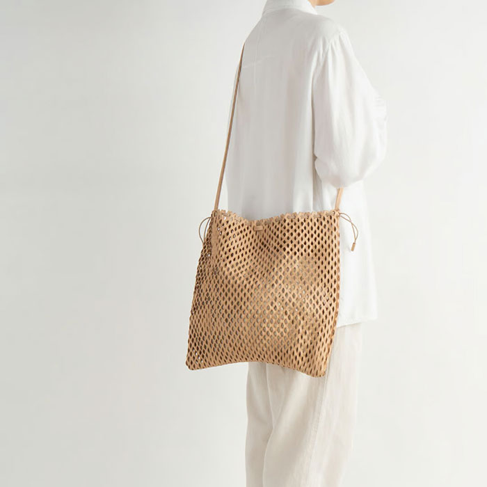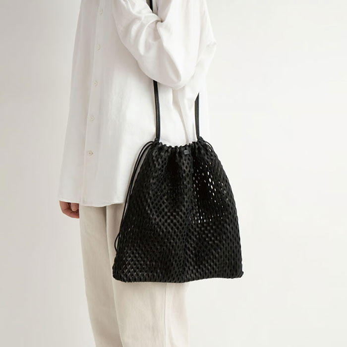 軽くて十分な容量のあるネット状のショルダーバッグ。A4サイズも入る、頼もしい存在です。内ポケットが1つ、開口部分にはスナップボタン付き。口元の切り込みに通したコードを絞ると巾着バッグにも。