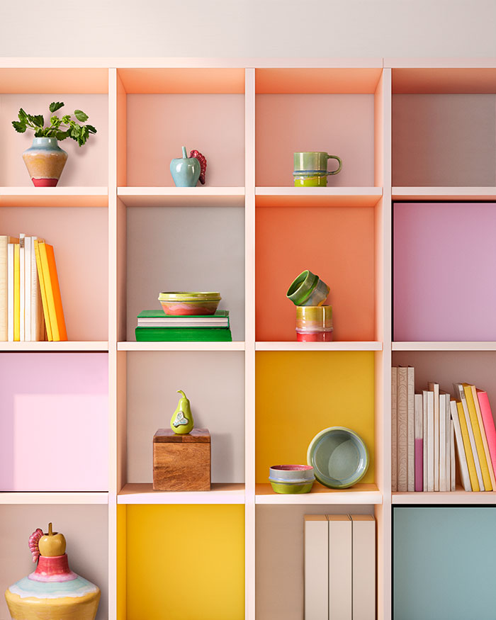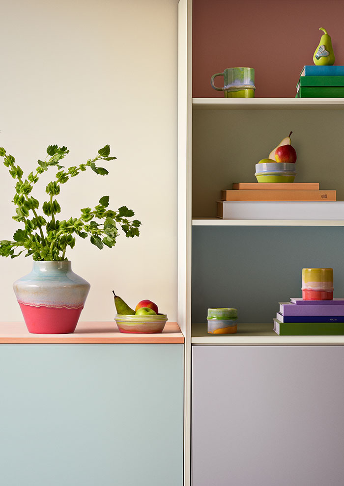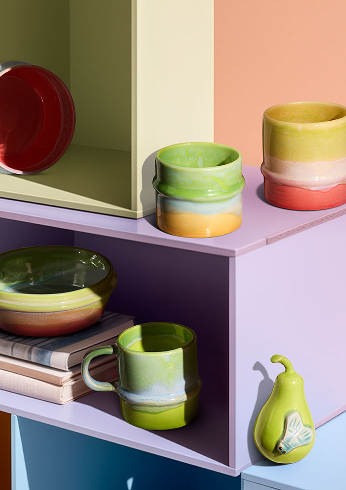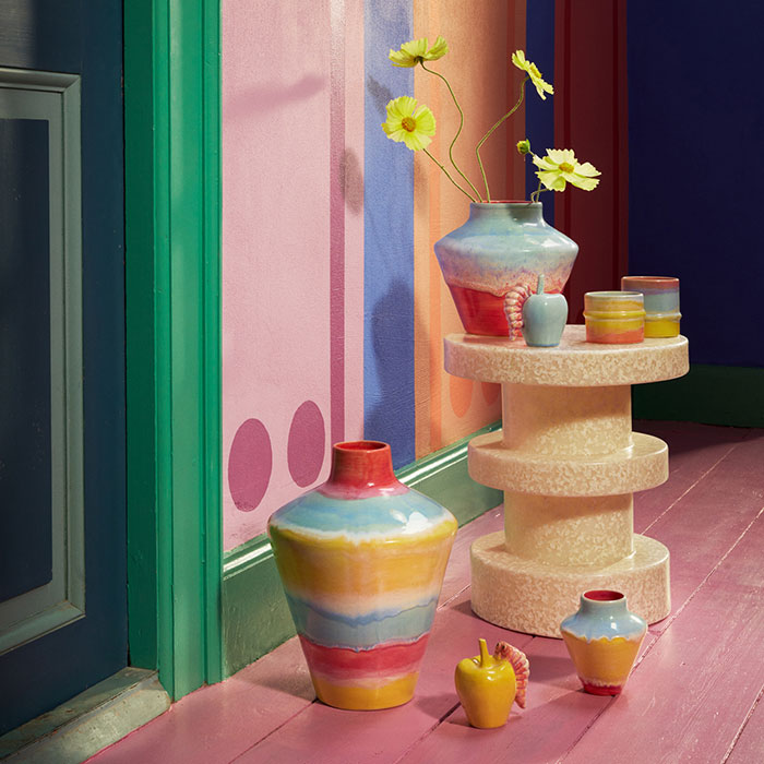 「ケーラー」と「キムポップ」により生まれた、カラフルでプレイフルな世界観が感じられるスペシャルアイテム。デザインだけでなく、釉薬や焼成についても「キムポップ」2人のアイデアが反映され作られています。置くだけで毎日が明るくなりそうな存在感!