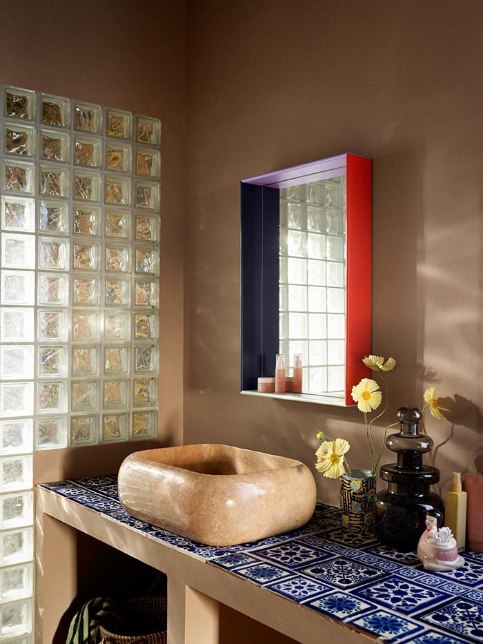 華やかに調和した4つのカラーが施された、大胆さと洗練さを兼ね備えたミラー。遊び心がありながら、力強く、エレガントな表情が魅力。同シリーズのシェルフKIMPOP SHOWとも相性抜群。コントラストの効いた4つのコンパートメントに愛用品を上品に収納すれば、空間の中でアートピースのような存在に。