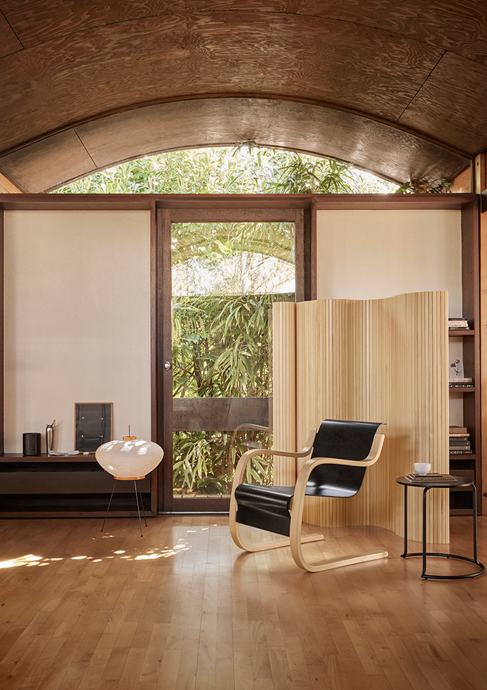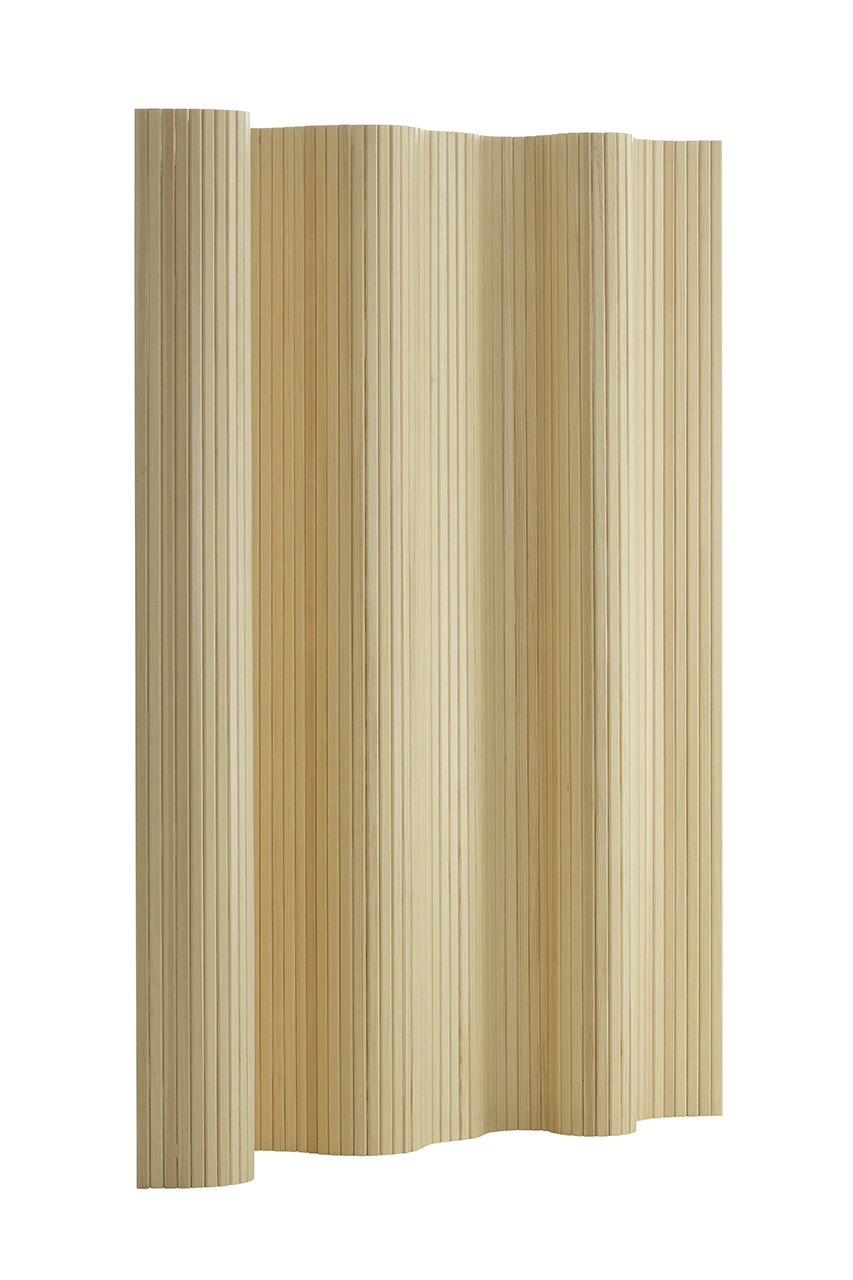 用途にあわせて自由に設置できる「パーテーション 100」は、既存の150cmの高さに加え、100cm、130cm、180cmの高さのモデルが復刻。パイン材を垂直に並べて繋ぎ合わせたシンプルな構造で、流れるような波上の曲線が特徴。空間の間仕切りに最適です。くるくると巻いてコンパクトに収納することも可能。
