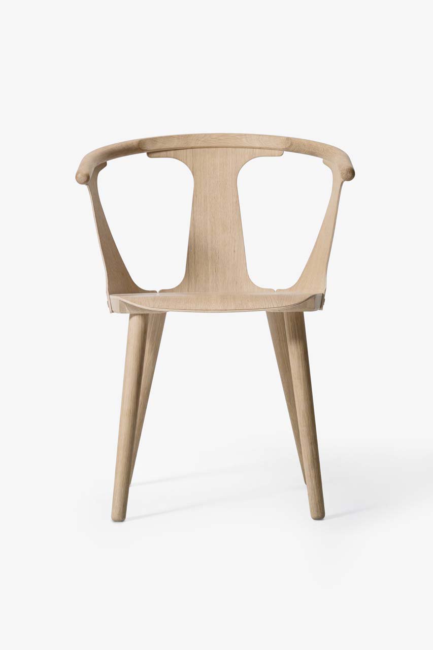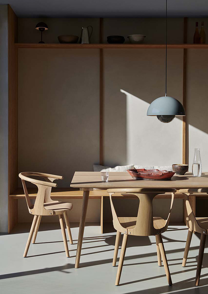 木工職人としての技術を磨いたサミ・カリオによる、「&Tradition/アンド トラディション」の「インビトゥイーン チェア」。3枚の木製パネルにあえて隙間を作りつなぎ合わせた背もたれ、座りやすさを考慮し優しいカーブを施した座面、椅子上部とバランスのとれた脚部など、ディテールまで美しい1脚。