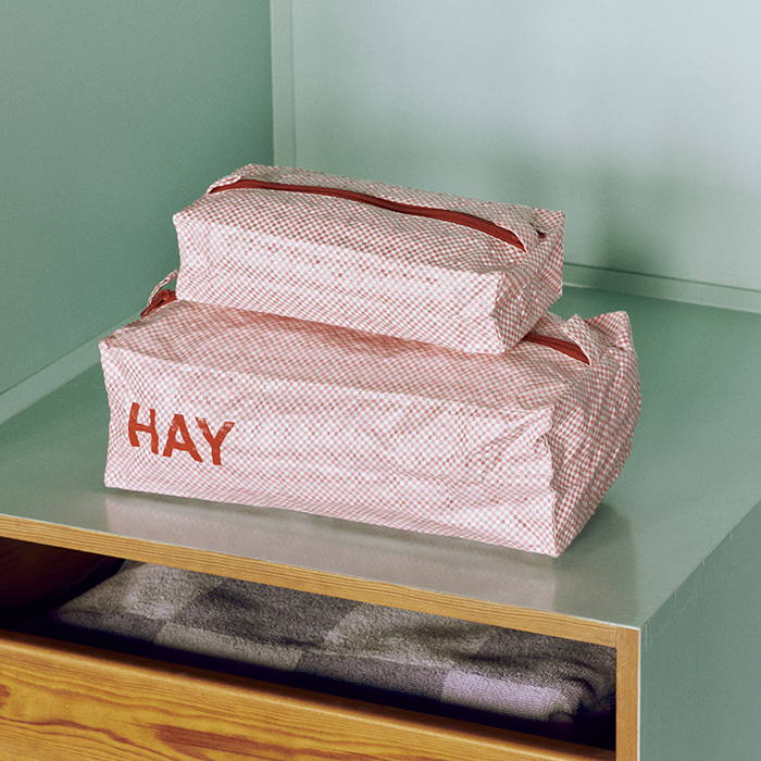リサイクルプラスチックを80%使用した、耐久性が高く旅行にもぴったりなポーチとバッグ。ポーチはマチのあるタイプとフラットなタイプの2種で、それぞれサイズの異なる便利な3個セット。バッグは、ちょっとしたお買い物や外出に使えて実用的。「HAY」のロゴがコントラストの効いたカラーであしらわれています。