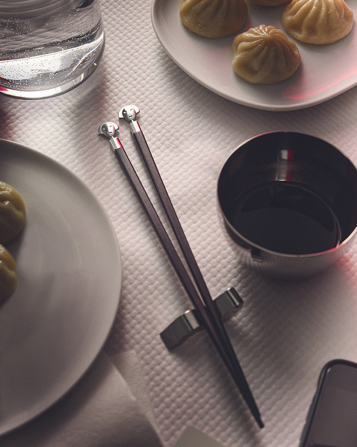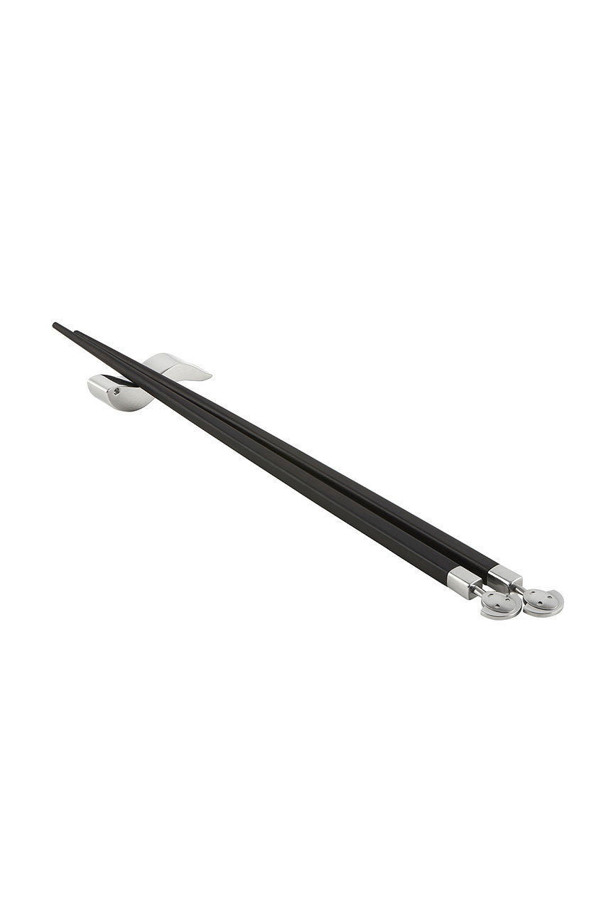 イタリアデザイン界の巨匠アレッサンドロ・メンディーニのデザインによる、「アレッシ」を象徴するキャラクター『Anna G.』と『Alessandro M.』。その装飾を施した黒檀の箸と、魚の形をしたおしゃれな箸置きのセット。箸はなめらかな質感と黒い光沢が美しく、テーブルに洗練されたユーモアがプラス。