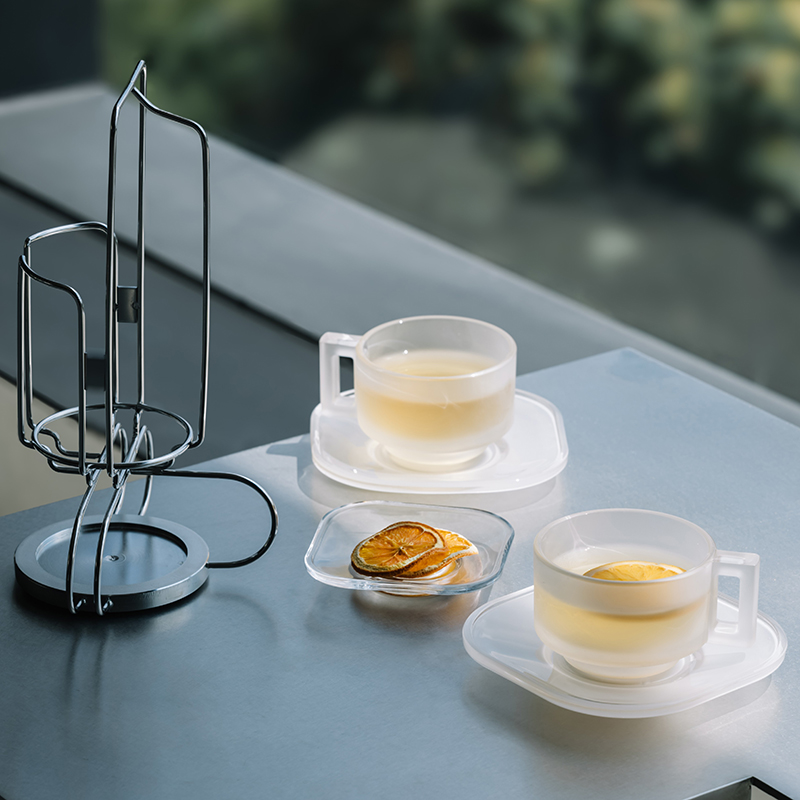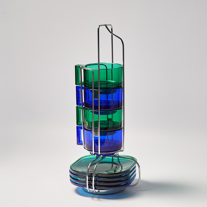 巨匠ジョエ・コロンボのデザインを 1960 年代当時と同じシステムでリプロダクト。四角い持ち手とミニマルでクラシカルなデザインが特徴的。クリスタルガラスの美しさが楽しめるカラーバリエーションも豊富。積み重ねて収納できる機能性も。