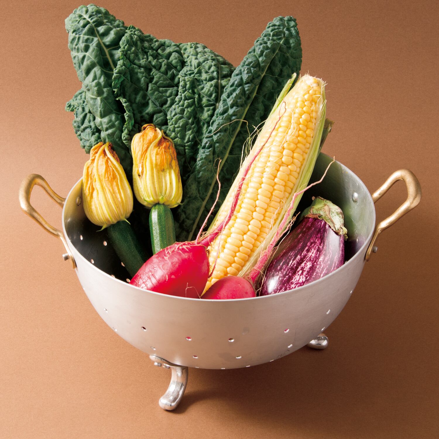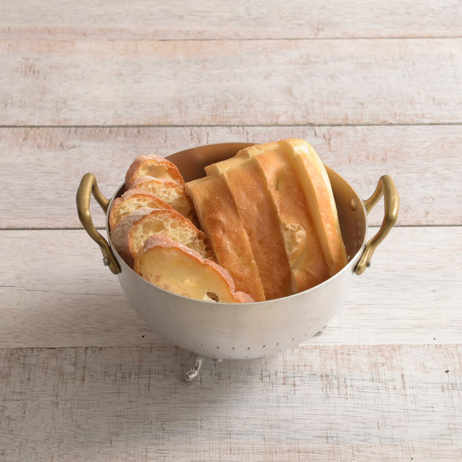 脚と真鍮製のハンドルが付いた「オティネッティ」のコランダーバスケットは、調理中にキッチンカウンターに置いて使用したり、パンやフルーツを入れて食卓に出したりと便利な存在。水切りタイプは水洗いした野菜や茹でたパスタの水切りに使えます。