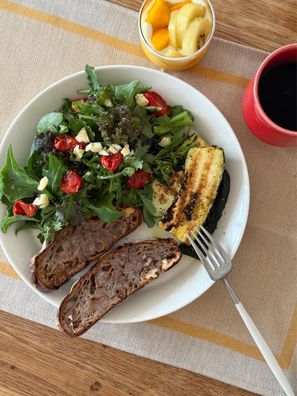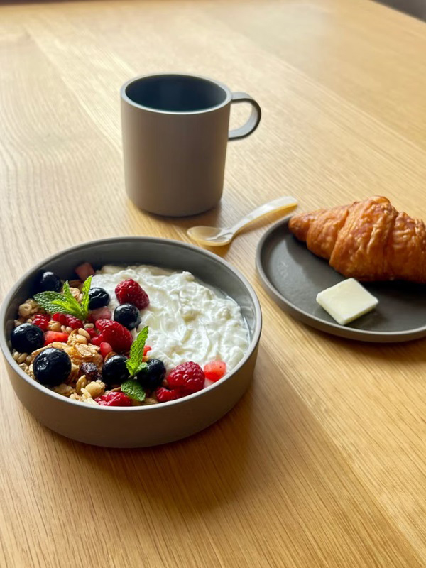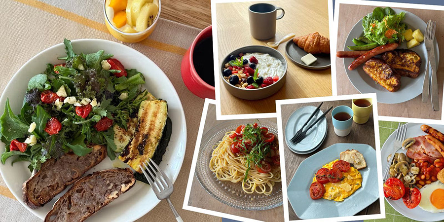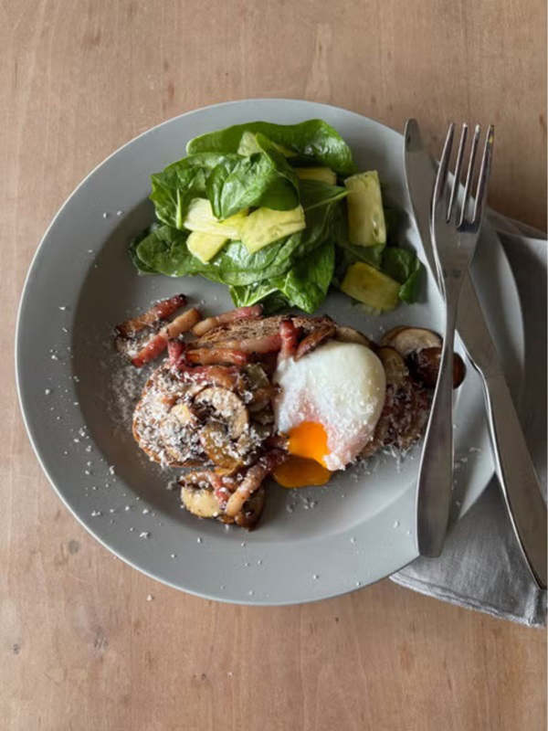 「朝ごはんは99.9%パンを食べる私。気分によってお皿を変えるのですが、最近のお気に入りは「Kura/クラ」のリムプレート。クールグレーというカラーリングがシックでコーディネートしやすいのと、リムが付いているので盛り付けがしやすい! シンプルにマッシュルームとベーコン、温泉卵のオープンサンドをのせて。」(エディターSATOKO)