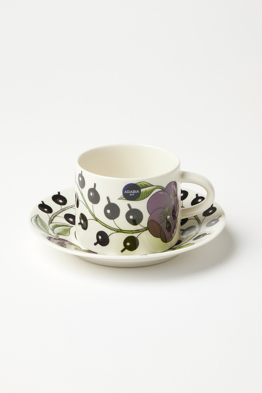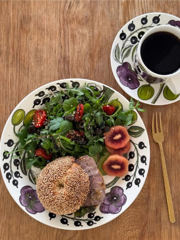 「柄物の食器はあまり持っていませんが、「ARABIA/アラビア」のパラティッシだけは別。10年ほど前にパープル&グリーンの配色に一目惚れしてプレート3枚とカップ&ソーサーを購入。華やかなので簡単な朝食でも気分が上がるひとときに。」(編集長 KIRIKO)