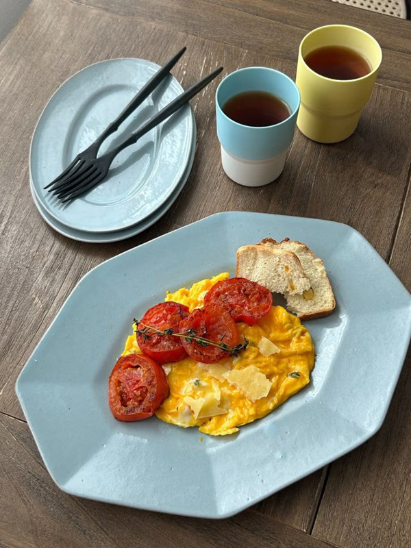 「丁寧につくられたうつわが揃う「アメノイエ」の「marais(マレ)」は、愛知県常滑市の窯元、山源陶苑とアメノイエが手がけたシリーズ。つるりとしたなめらかな質感とやわらかな色合いで、料理と自然に調和してくれます。「スクランブルエッグと焼きトマト」を作ってみたところ、食材の色が映える素敵なモーニングに。ポップなカラーリングで心が弾む「1616/arita japan」の「S&B Mug」と合わせて、春夏はカラフルなテーブルコーディネートを楽しみたいです。」(エディターHINAKO)