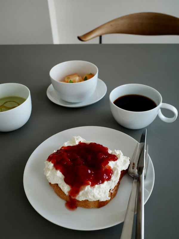 「最近は、フォルムがきれいな白磁の器の潔さにも惹かれます。デザイナーのステファン・ディーツが「2016 /」のために手がけたプレートは、緩やかな立ち上がりがあって使い勝手よし。コーヒーカップも持ち手の曲線が優美です。ブリオッシュトーストにたっぷりのリコッタチーズとジャムを盛ったちょっと派手めなメニューもすっきりと映えます。」(エディターTAKAFUMI)
