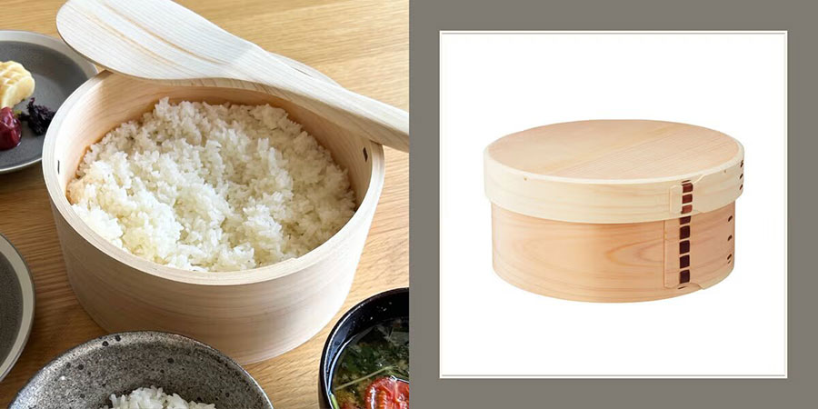 耐水性の高いひのきとさわらを使って昔ながらの技法で作られていて、木肌の風合いに癒されます。職人技でなめされた、つややかな桜皮の留め具も素敵。木の調湿作用で余分な水分を吸い取り、ごはんをみずみずしく保ってくれます。