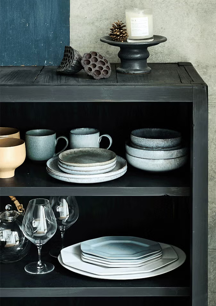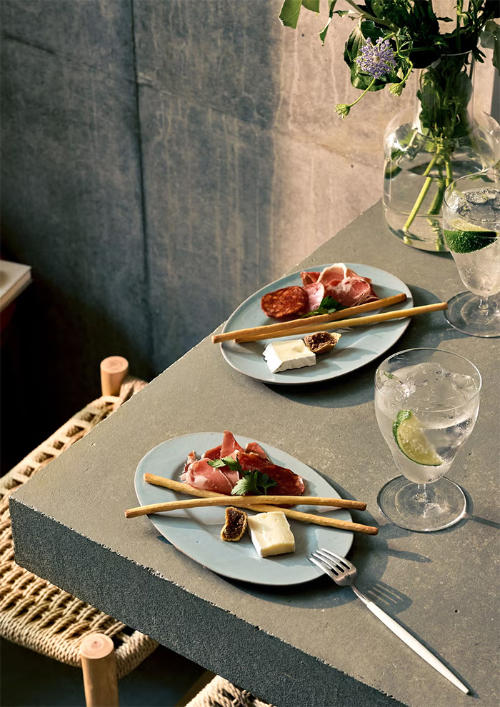 17時、雨野さんがさらっと用意してくれたのは、生ハム、チーズ、ドライフルーツ。気取らないつまみなのに、「マレ」の楕円プレートに乗ると、途端に品良く見えます。「ちょっとしたおつまみが、きちんと料理っぽく見えるの。この青色、生ハムのピンクが立ち上がる」と、雨野さん。