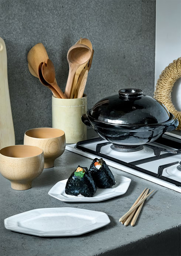 「カネダイ陶器」の美しい黒い土鍋に炊きたての白米の艶がふわっと浮かび、朝のキッチンにごはんの香りが漂います。「ふたもぴたっとしまるから信頼してるの」と、雨野さん。おにぎりは、白釉のにじみがアンティークみたいな「marais(マレ)」の 八角プレートに。箸は、東京・墨田区で職人が手作業でつくられている、細くて軽い「大黒屋」の八角箸。