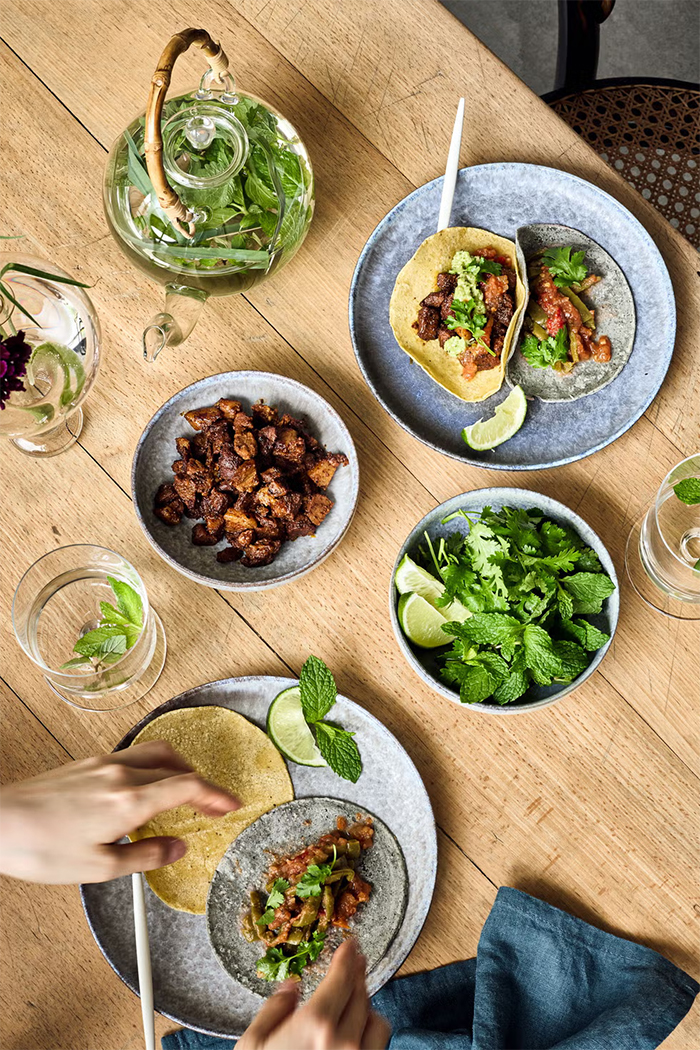 人が集まり、ランチ会がゆるやかにスタート。トルティーヤを乗せた器はホワイトとブルー、大小まぜこぜ。「これ、fog(フォグ)っていうシリーズで、作山窯が作ってるの。美濃焼なんだけど、独自の土と釉薬、焼き方の組み合わせで、洋の料理にも自然に合う色と風合いになってるんだって」。食材を乗せたいと思わせてくれる器です。