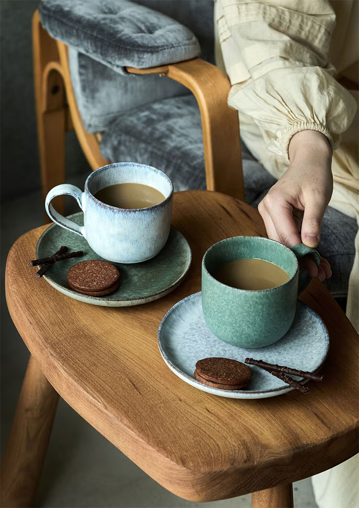 食後のコーヒータイムも「フォグ」のカップで。マットな質感が手に心地よく、コーヒーの味までやさしくなった気がします。15cmのプレートを受け皿にすることで、専用のセットじゃないのに、むしろちょっとだけ工夫した感がさりげなくおしゃれ。プレートの広い余白には、クッキーとチョコレートを。