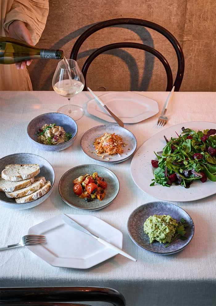 夜ご飯に並ぶキャロットラペ、トマトサラダ。どれも気負いのない料理なのに、「フォグ」に盛られると場が整ってきます。サラダは「マレ」の楕円プレートにふわっと。朝のおにぎりに使っていた八角プレートは、ここでは取り皿に。「フォグ」と「マレ」は形も釉薬も全然違うのに、不思議となじみ、食卓の心地よさを生んでいます。