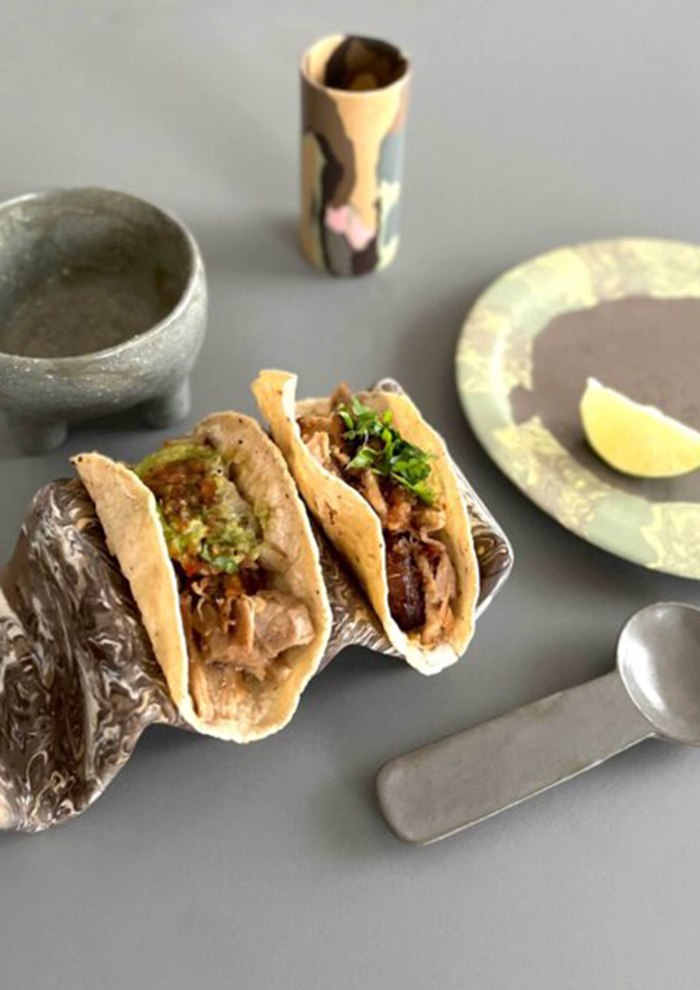 東京・代々木上原の実力派トルティーヤ専門店、「NEW CLASSIC TORTILLA CLUB」が人気陶芸作家・タカノミヤさんに別注した器やカトラリー。色の異なる粘土を合わせて作る、ユニークなマーブル模様が特徴。「タコスホルダー」や、サルサの材料を混ぜるための「モルカヘテ」を揃えて、暑い日のタコスを楽しみたい!